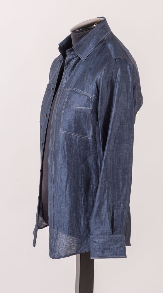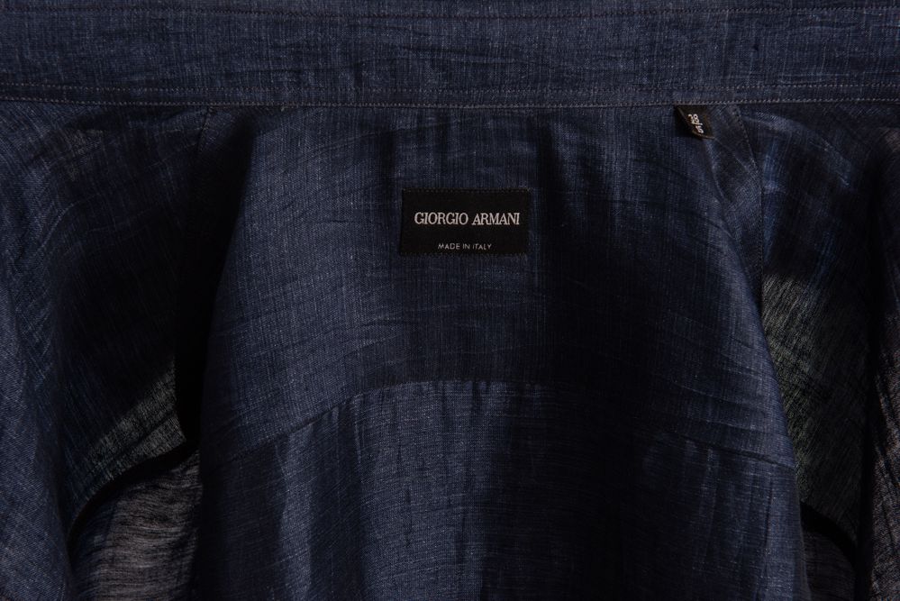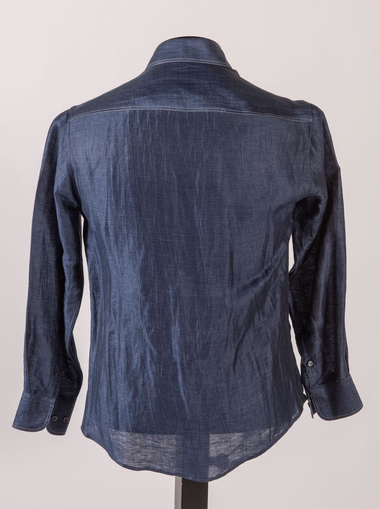 GIORGIO ARMANI Camicia in seta e lino sui toni del blu. Riporta taglia 38. Composizione: 88% lino, 12% seta. Reca etichetta Giorgio Armani Made in Italy.