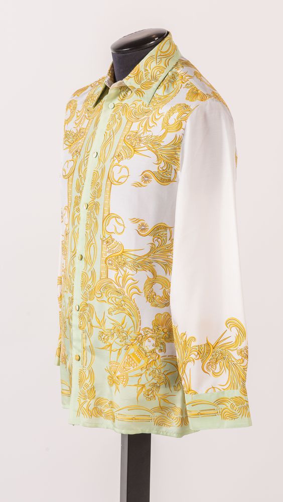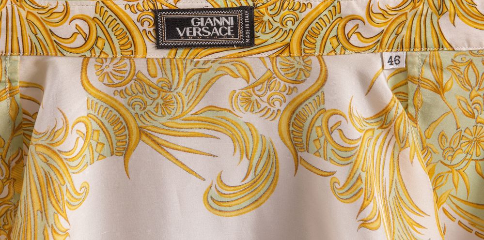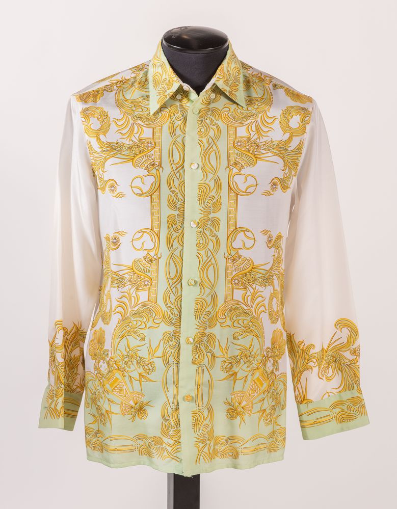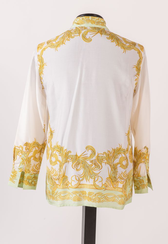 GIANNI VERSACE Camicia in seta con fantasia a greche e a fiori sui toni del verde, giallo e bianco. Anni '90 ca. Riporta taglia 46. Reca etichetta Gianni Versace Made in Italy.