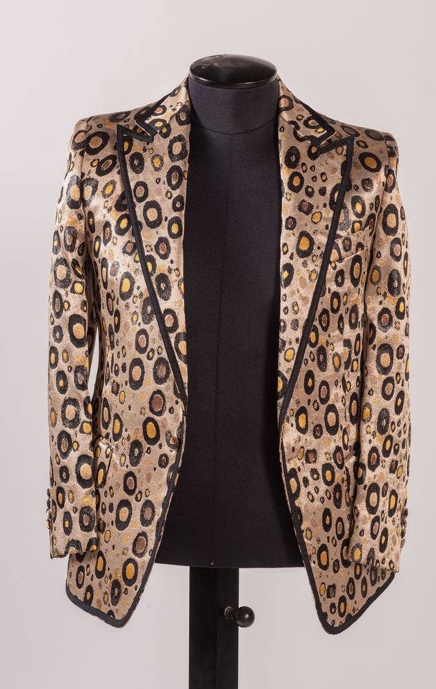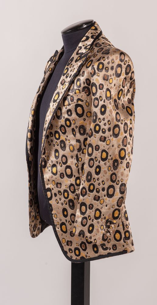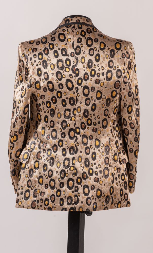 FENDI Giacca in seta con fantasia sui toni dell'oro del nero. Riporta taglia 48. Interno rifinito in seta nera. Composizione esterno: 92% poliestere, 8% poliammide. Composizione interno: 100% seta. Riporta etichetta Fendi made in Italy con codice di riferimento prodotto. Corredata di due bottoni di ricambio.