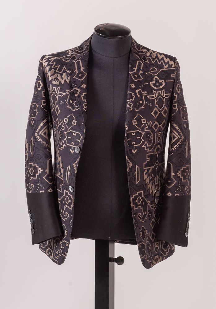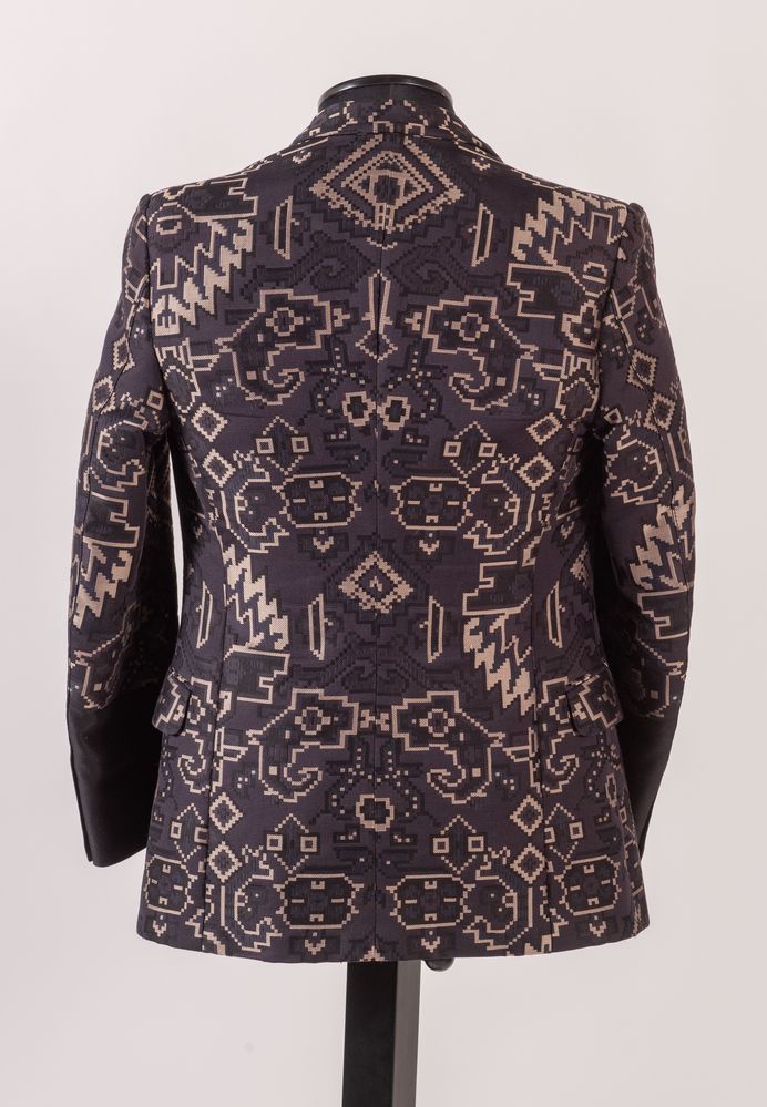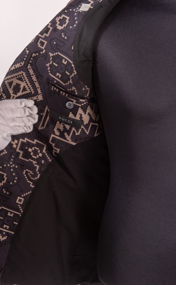 GUCCI Giacca in cotone e seta a fantasia geometrica sui toni del blu, nero e beige. Riporta taglia 46. Interno rivestito in tessuto di cotone nero. Composizione esterna: 82% cotone, 18% seta. Composizione interna: 100% cotone. Reca etichetta Gucci. Corredata di bottoni, pezzo di stoffa di ricambio e custodia porta abiti originale.