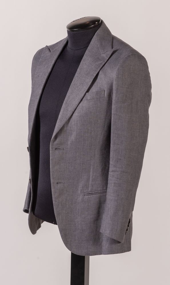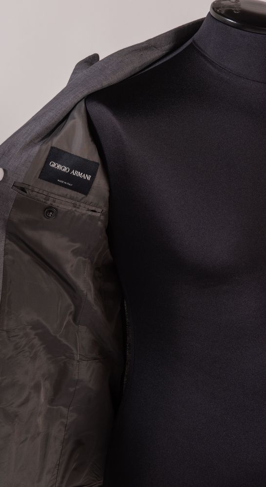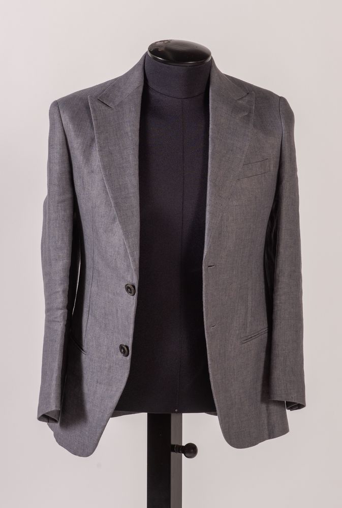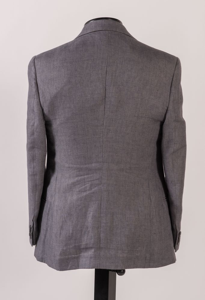 GIORGIO ARMANI Giacca in lino e cotone grigia. Reca taglia 48. Interno rivestito in tessuto sintetico nero. Composizione esterno: 60% lino, 40% cotone. Composizione interno: 100% cupro. Reca etichetta Giorgio Armani Made in italy. Corredata di due bottoni di ricambio in apposita dustbag e custodia porta abiti originale.