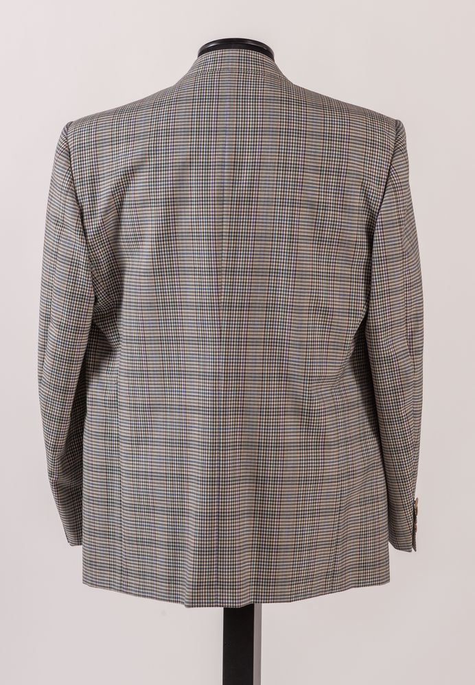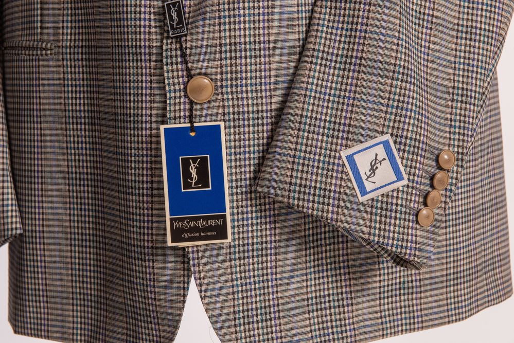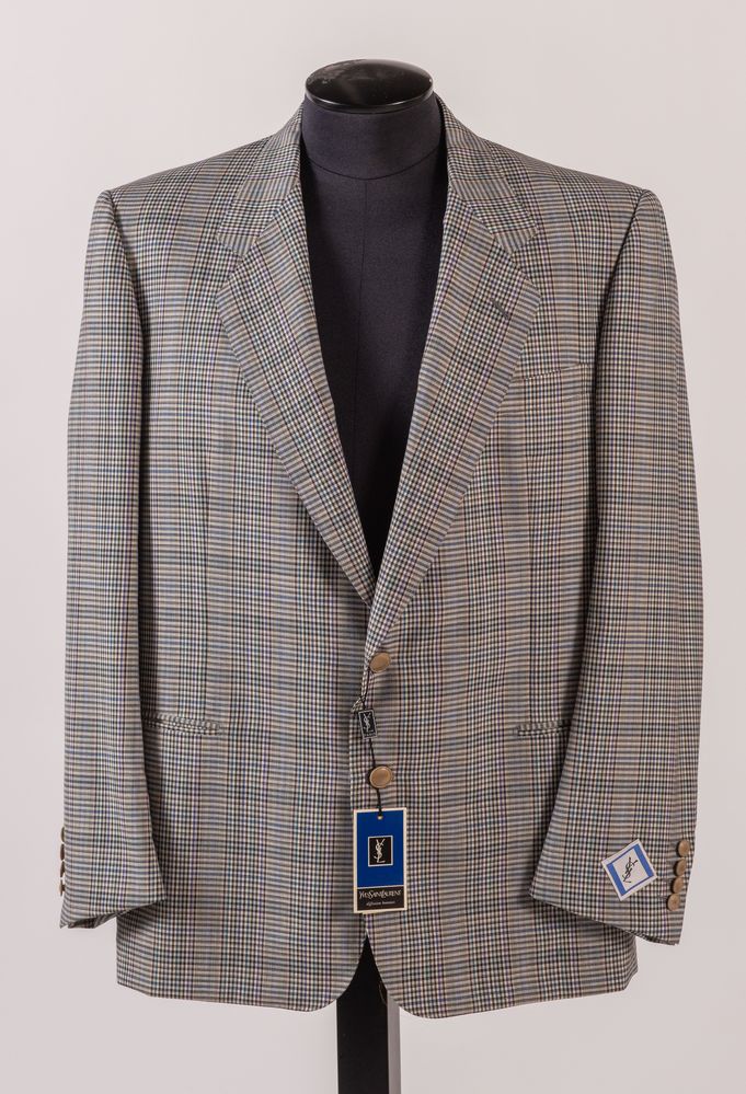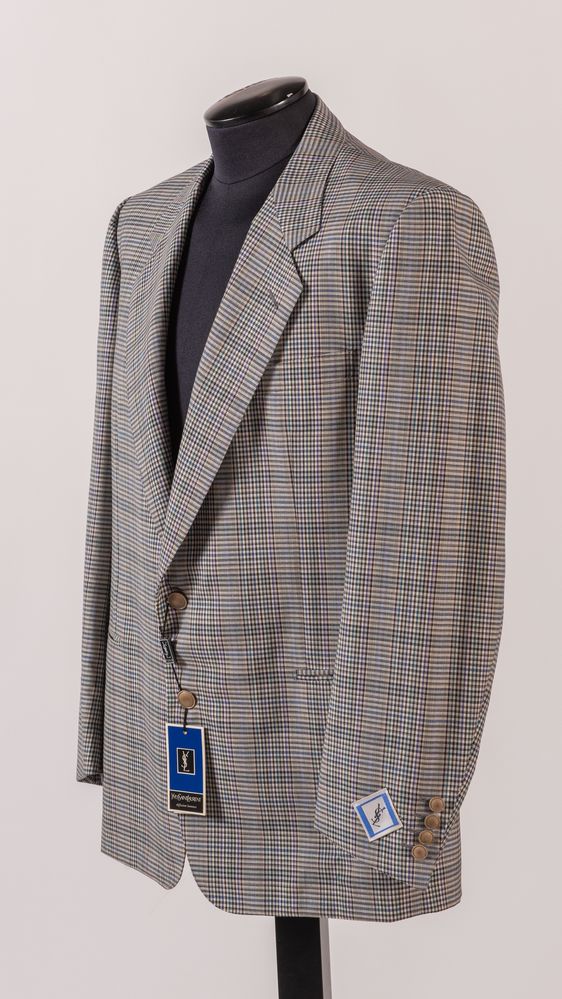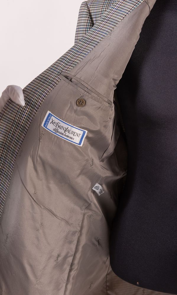 YVES SAINT LAUREN Diffusion Hommes Giacca maschile in tessuto leggero di lana con fantasia quadrettata. Riporta taglia 56. Composizione:100% lana vergine. Reca etichette Yves Saint Laurent diffusion hommes Made in Italy e cartellino con dettagli e specifiche del prodotto.