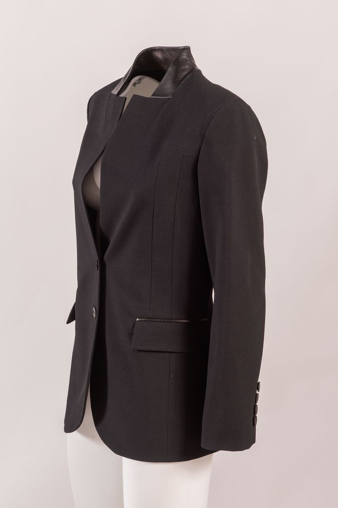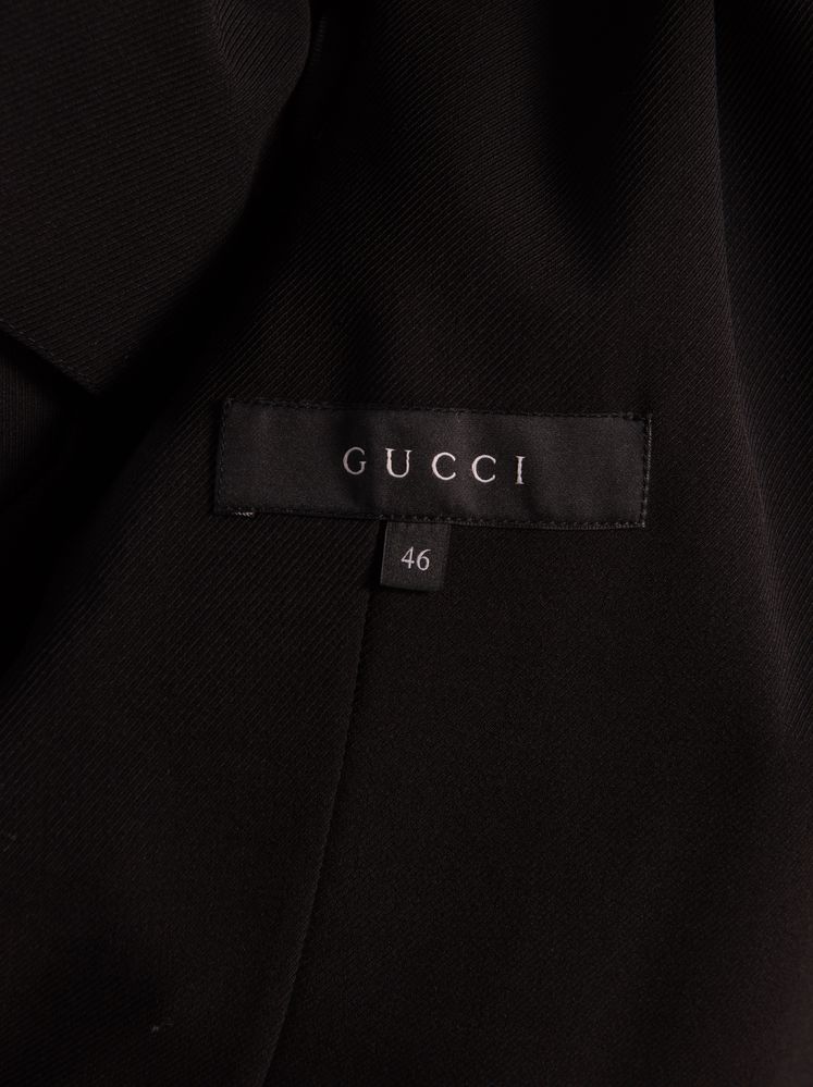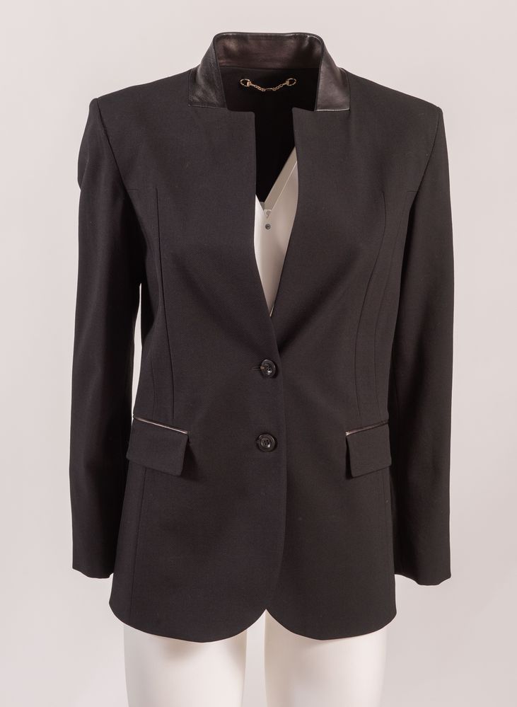 GUCCI Giacca in lana nera con colletto e rifiniture in pelle. Riporta taglia 46. Interno rifinito in tessuto nero. Composizione: 97% lana, 3% elastane. Composizione colletto e rifiniture: 100% pelle. Reca marchio ed etichetta Gucci. Corredata di custodia porta abiti originale.