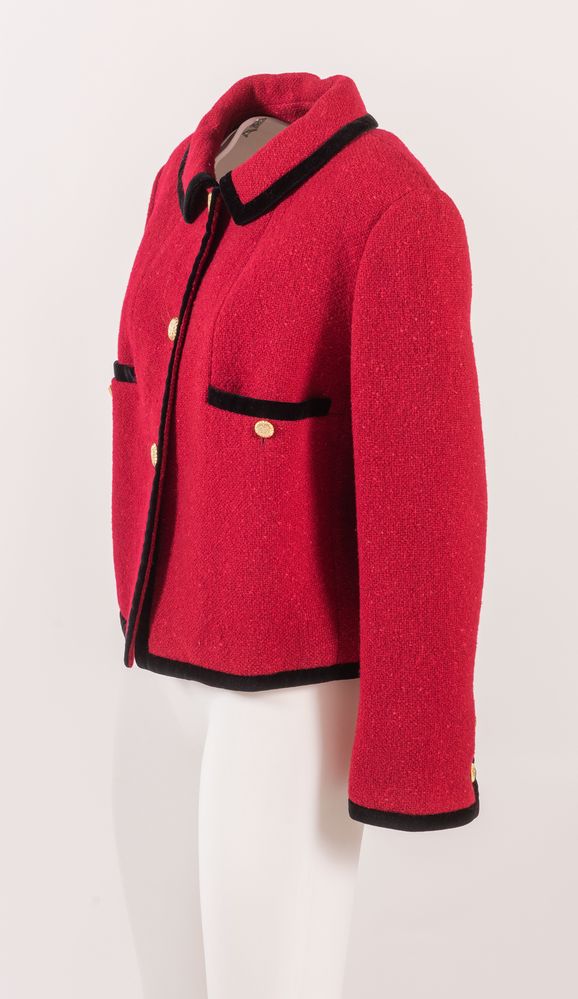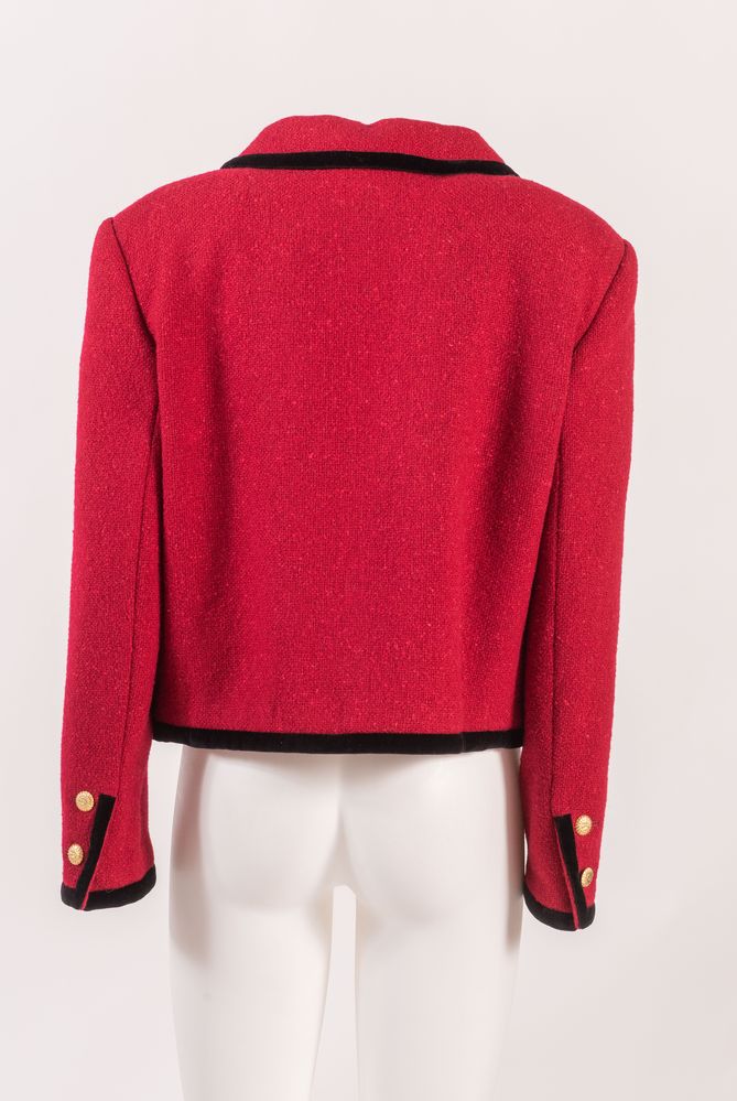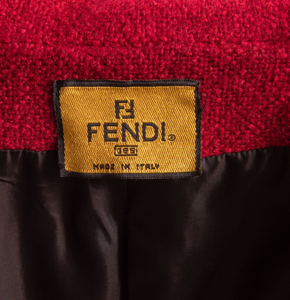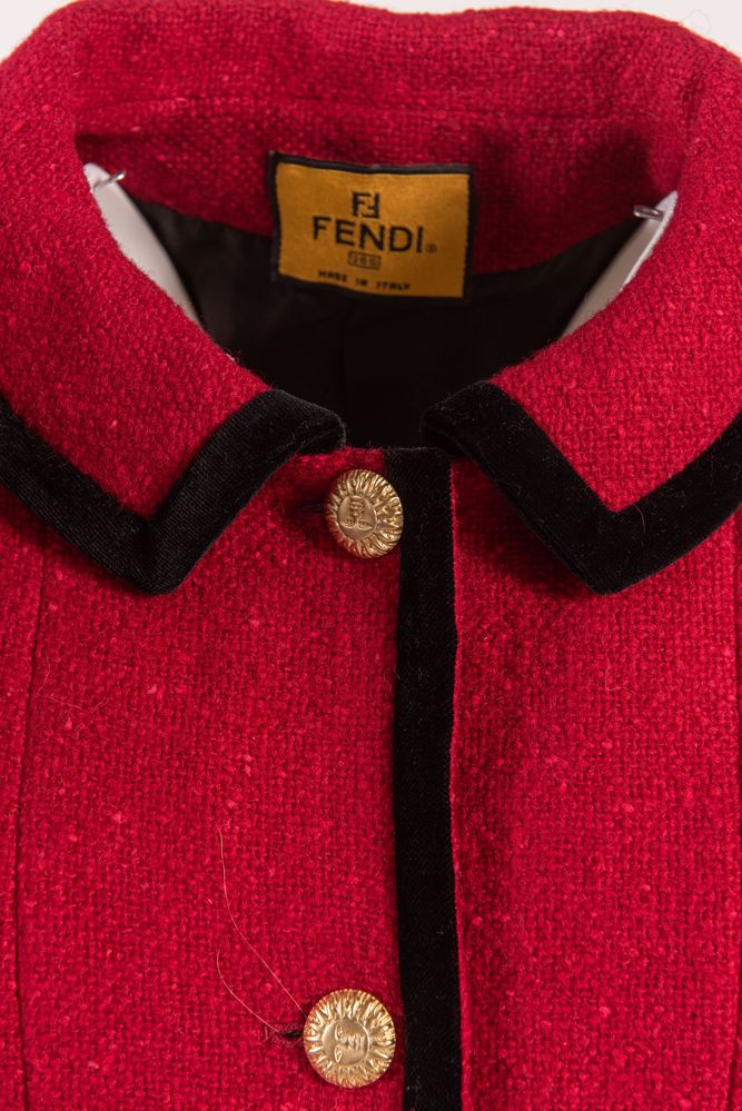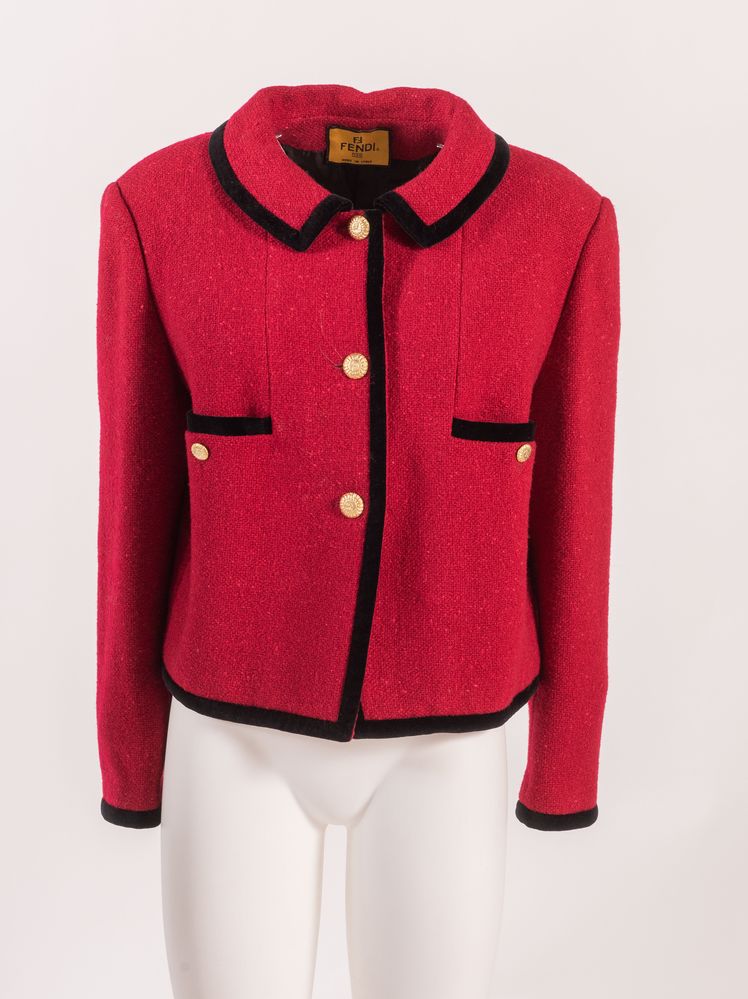 FENDI Giacca in lana e cotone rossa con rifiniture in velluto e bottoni in metallo dorato. Riporta taglia 44. Interno rifinito in fodera sintetica nera. Cartellino di composizione parzialmente leggibile. Reca etichette Fendi 365 Made in Italy. (Lievissimi difetti)