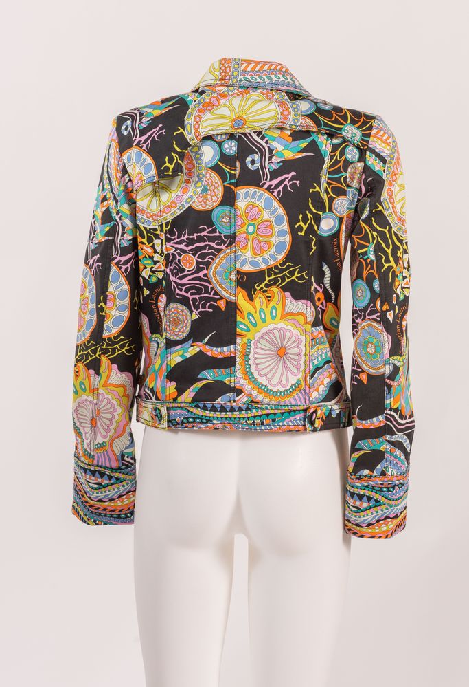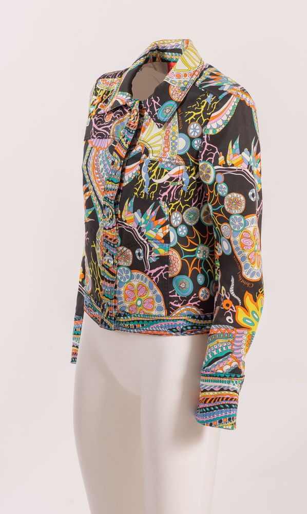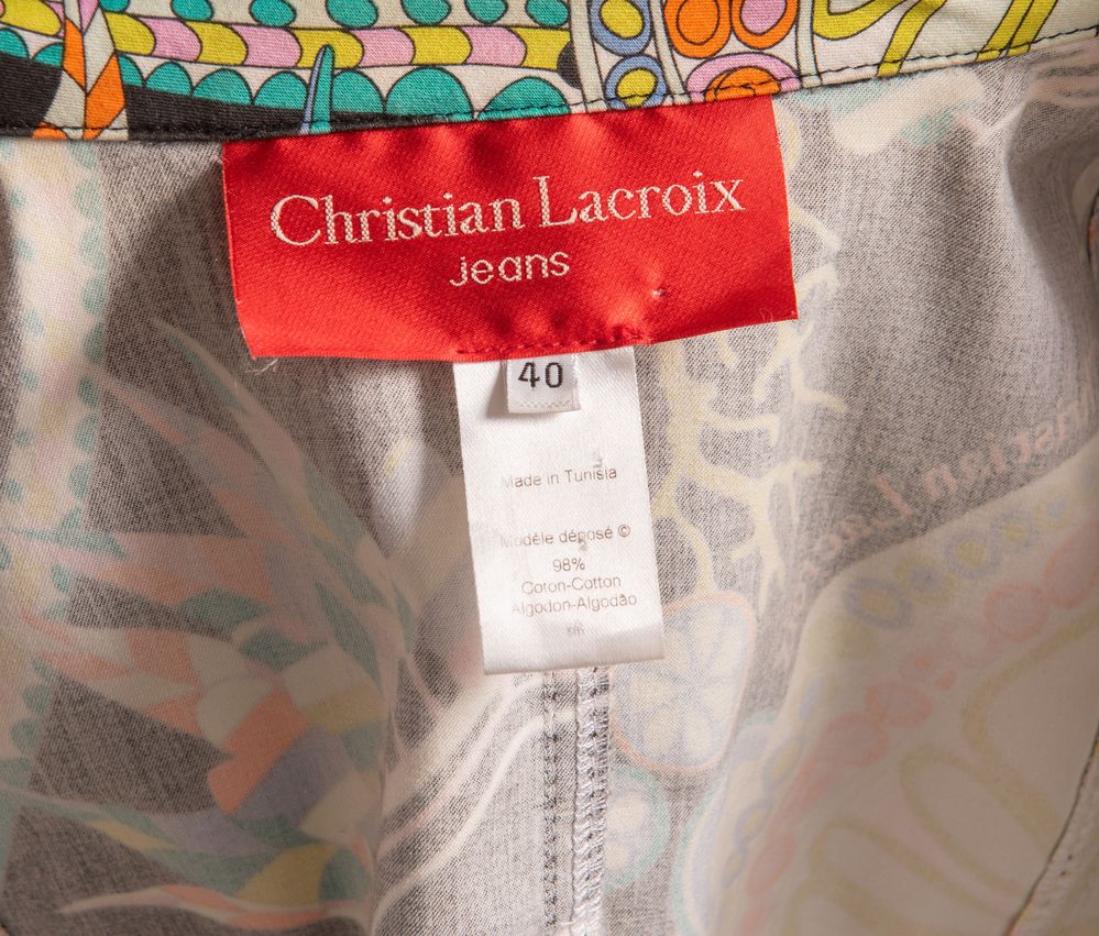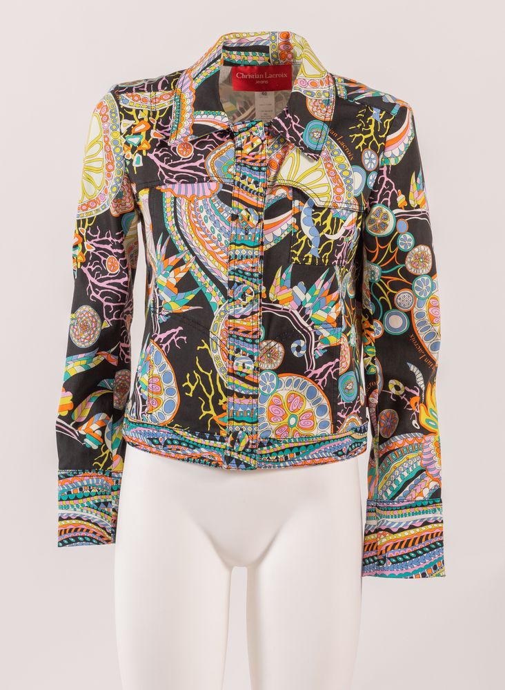 CHRISTIAN LACROIX Jeans Giacca leggera multicolore in cotone con chiusura a bottoni. Riporta taglia 40. Composizione: 98% cotone, 2% elastano. Reca etichetta Christian Lacroix Jeans.