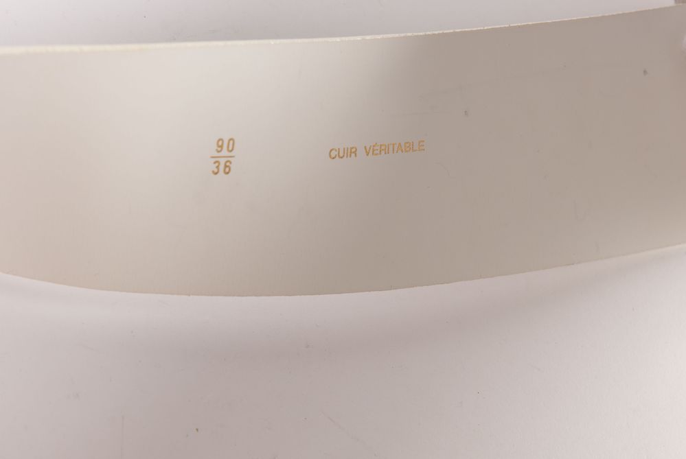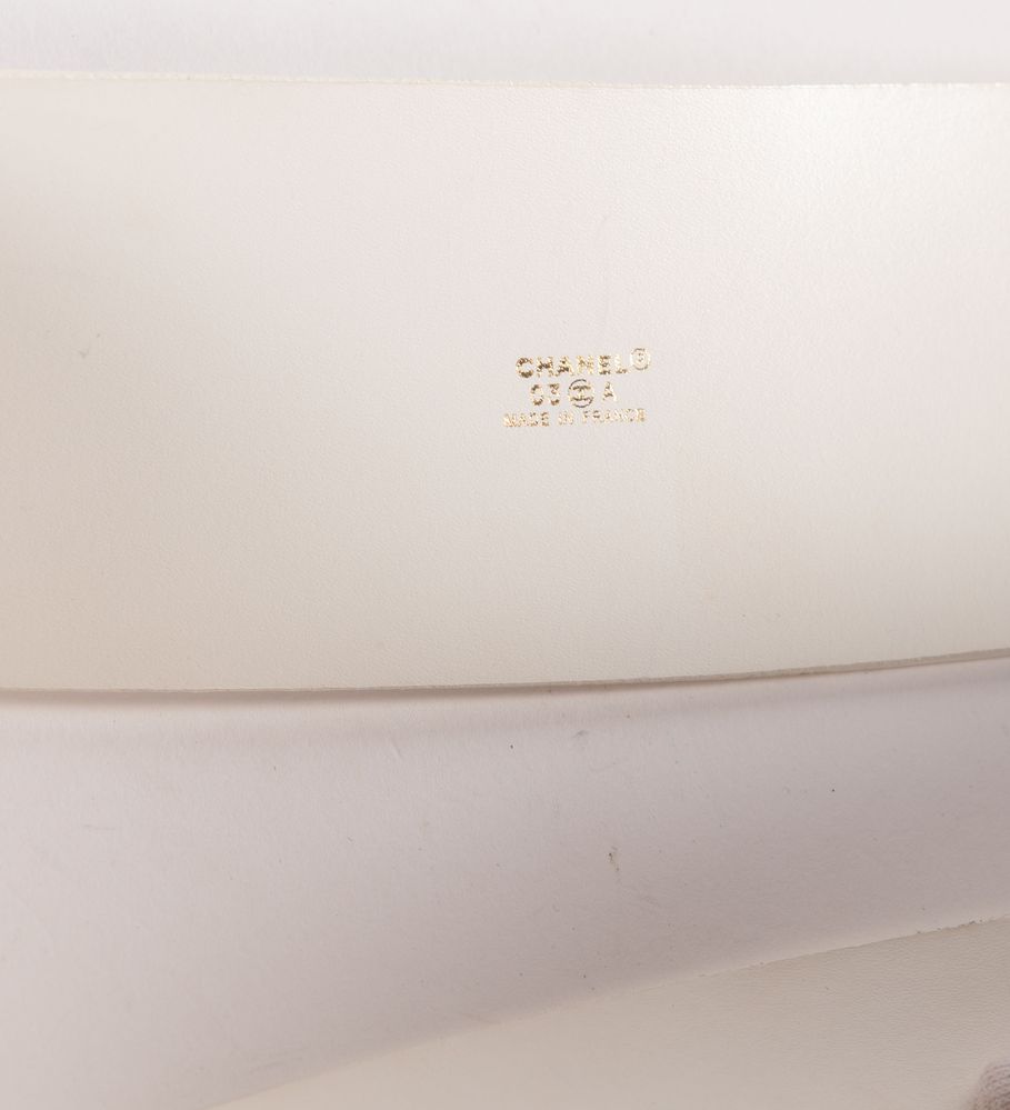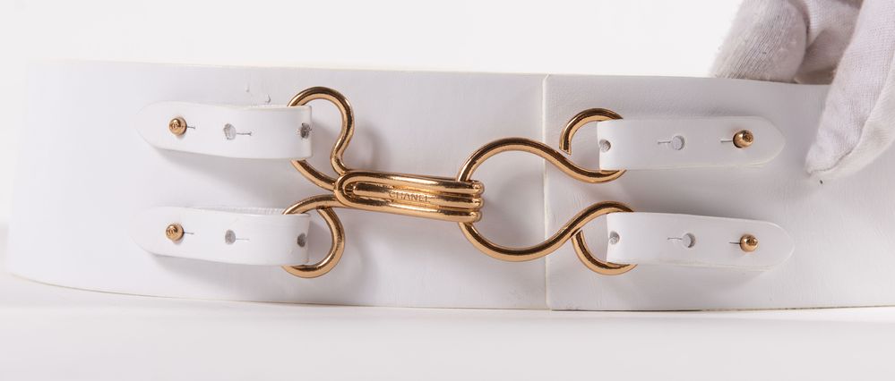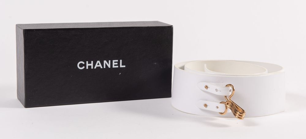 CHANEL Cintura spessa in pelle liscia bianca con dettaglio della chiusura in metallo dorato. Lunghezza totale: cm 110. Spessore fascia: cm 6. Riporta misura 90/36. Reca marchi Chanel, Chanel 03 A Made in france e cuir véritable. Corredata di scatola originale. (Lievi difetti)