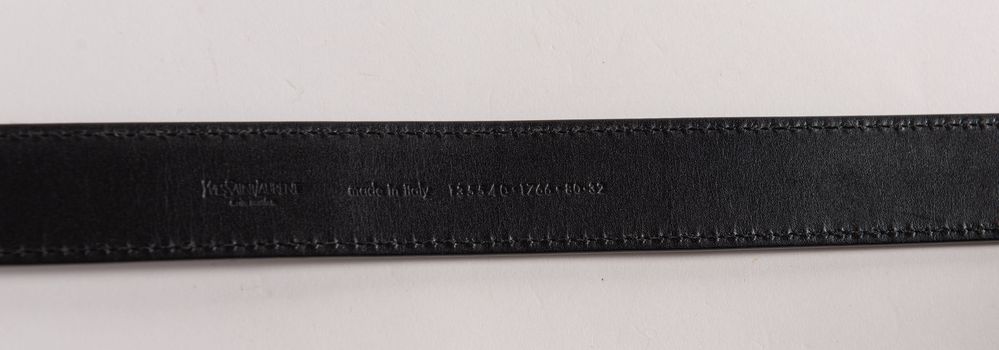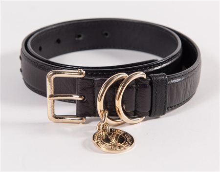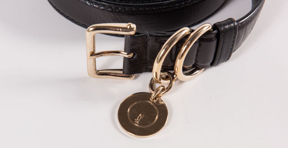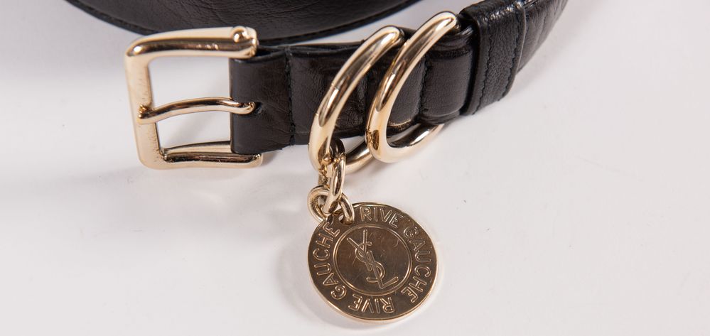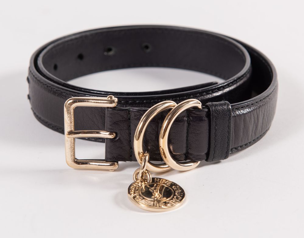 YVES SAINT LAURENT Rive gauche Cintura in pelle nera con fibbia e passanti in metallo dorato e arricchiti da charm con logo e marchio. Lunghezza totale: cm 97. Spessore fascia: cm 3. Fibbia: cm 4x7,5. Reca marchi YSL Rive gauche, Yves saint Laurent Rive gauche Made in Italy e codice di riferimento. (Difetti)
