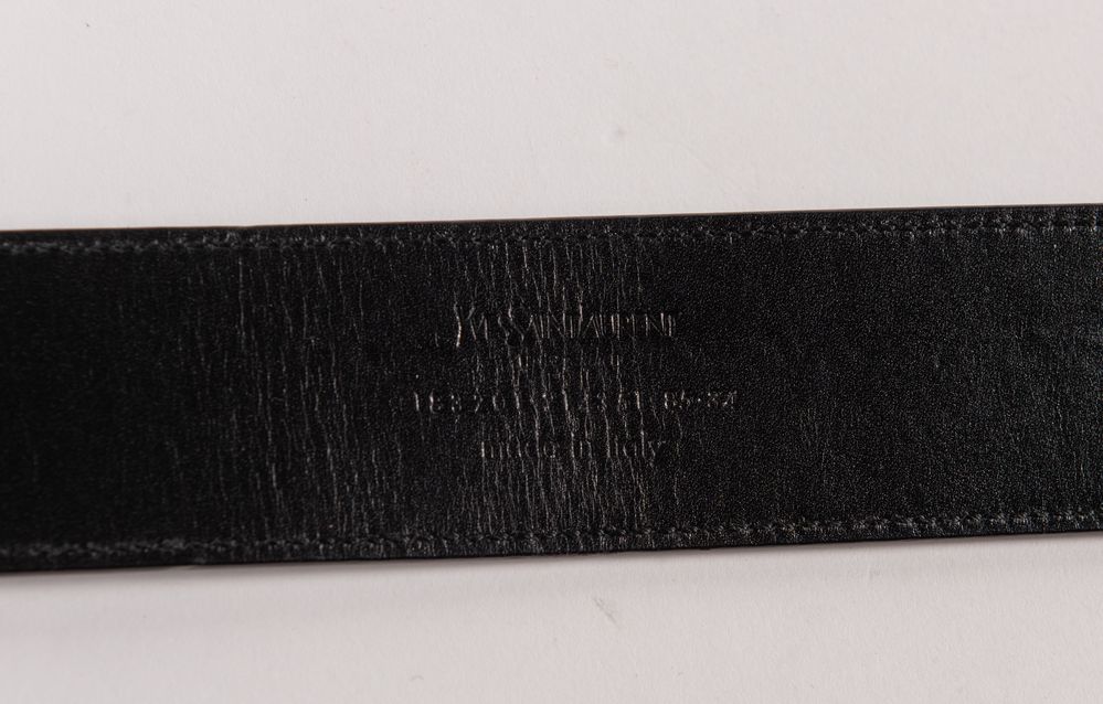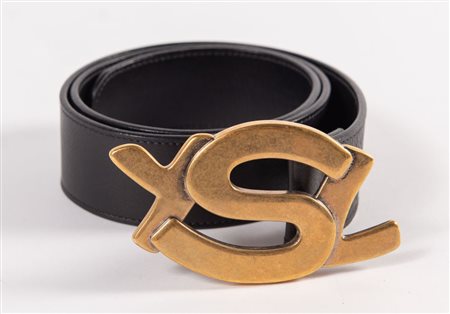YVES SAINT LAURENT Cintura in pelle nera con fibbia in metallo dorato. Lunghezza totale: cm 98. Spessore fascia: cm 3,5. Fibbia: cm 5x7. Reca marchi YSL, Yves Saint Laurent Rive gauche Made in Italy e codice di riferimento. (Difetti)