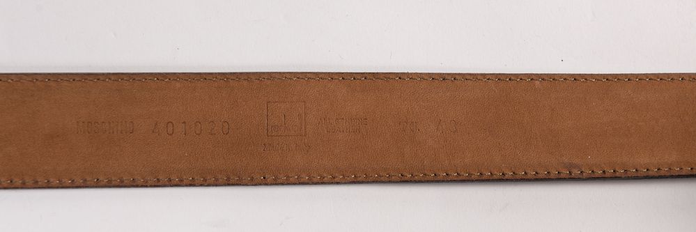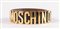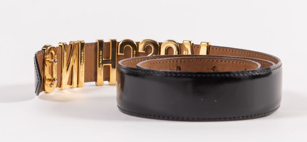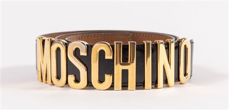 MOSCHINO for Redwall Cintura in pelle nera con fibbia e dettaglio del logo in metallo dorato. Lunghezza totale:cm 100. Spessore: cm 3,5. Reca marchi Moschino e Redwall Made in Italy. (Lievi difetti)