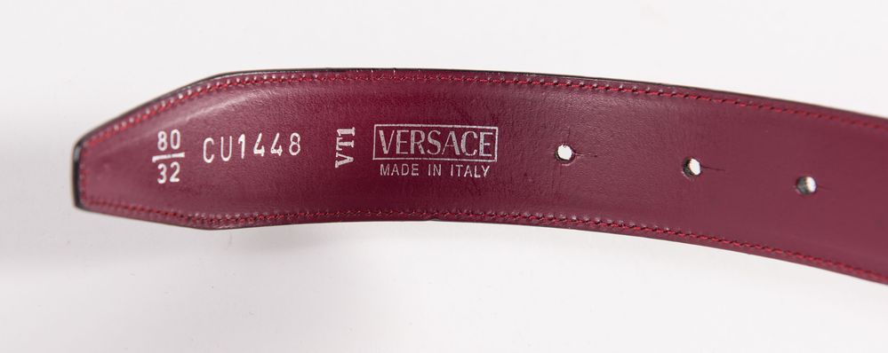 VERSACE Cintura in pelle nera con fibbia in metallo argentato. Lunghezza totale: cm 90. Spessore fascia: cm 3. Fibbia: cm 5,5x6,2. Riporta taglia 80/32. Reca marchi VT1 Versace Made in Italy e codice di riferimento. (Lievissimi difetti)