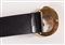 GUCCI Cintura in pelle nera con fibbia in metallo dorato a forma di G realizzata come una testa di cavallo. Lunghezza totale: cm 95. Spessore fascia: cm 4. Fibbia: cm 6. Reca marchi Gucci Made in Italy e codice di riferimento. (Lievi difetti)