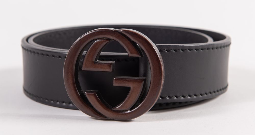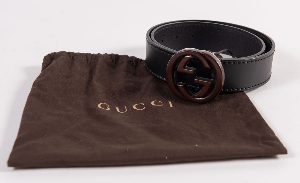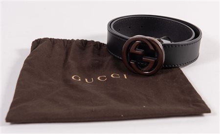 Lot 303 | GUCCI Cintura in pelle nera con fibbia in metallo argentato rivestita in...