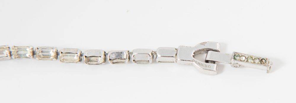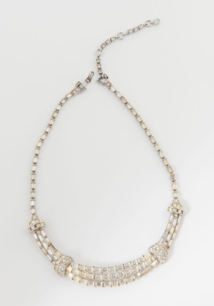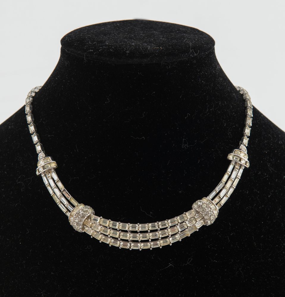 PENNINO Collier in metallo argentato decorato con zirconi. Circonferenza collo: cm 41. Reca marchio Pennino. (Difetti)
