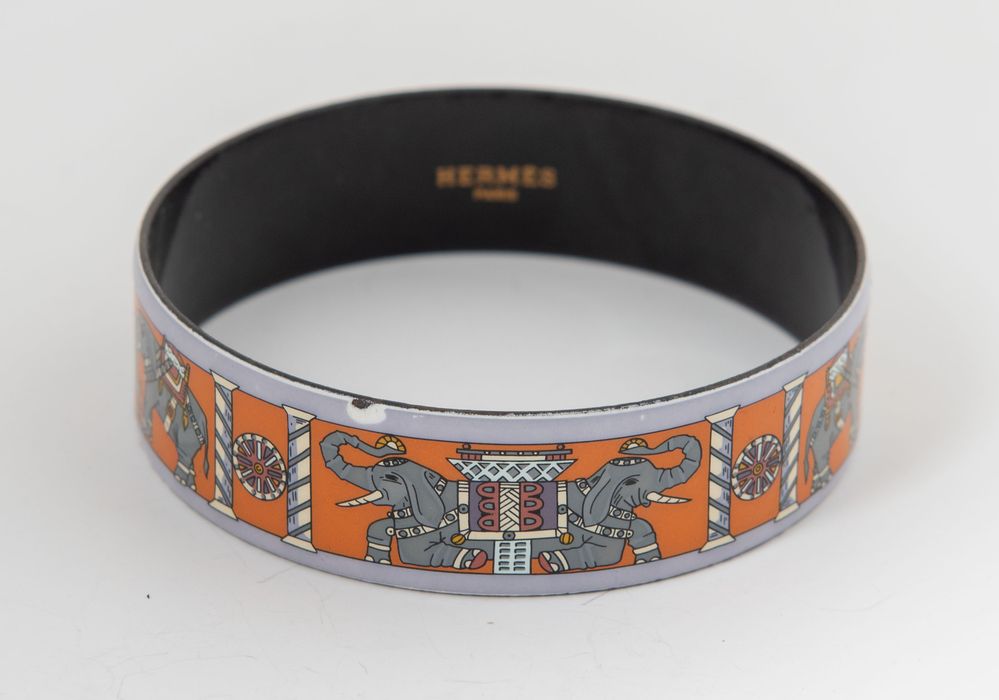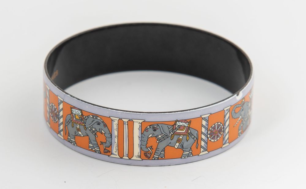 HERMÈS Bracciale a fascia rigida smaltato raffigurante elefanti e motivi decorativi sui toni del grigio e dell'arancione. Anni '90. Diametro: cm 7. Altezza fascia: cm 2. Reca marchi Hermès Paris, Made in Austria + L. (Difetti)