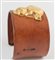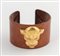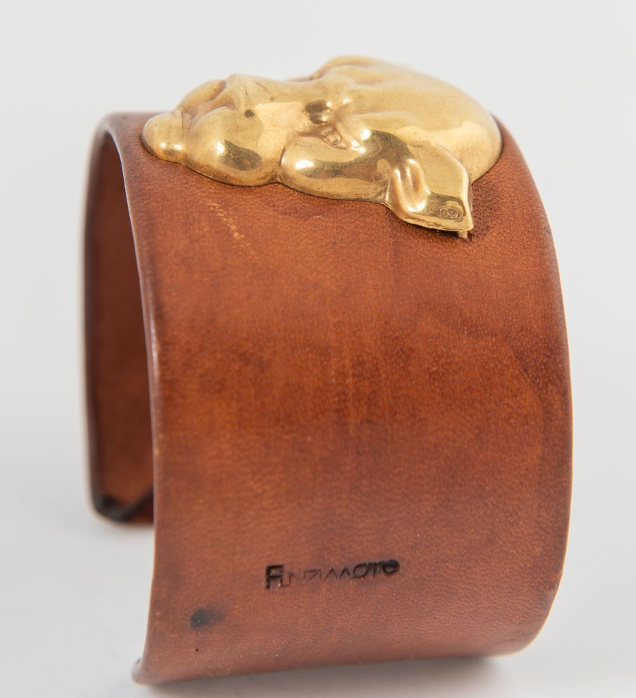 ANONIMO Bracciale rigido realizzato in cuoio con dettaglio a testa di leonessa in oro 750. Diametro: cm 6. Spessore fascia: cm 4. Sul cuoio reca marchio non identificato. Sulla testa di leonessa presenta punzone 750. (Difetti)