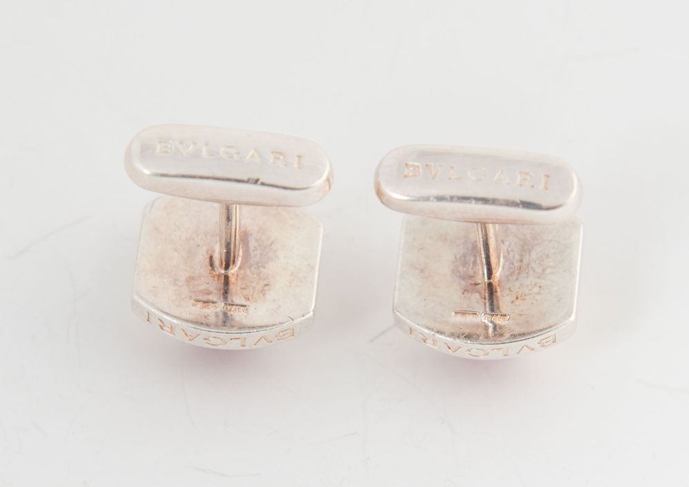 BULGARI Gemelli in argento 925 smaltati bordeaux. Cm 2x2x2,5 cad. Ciascuno reca marchio Bulgari e punzone 925. (Lievi difetti)