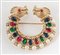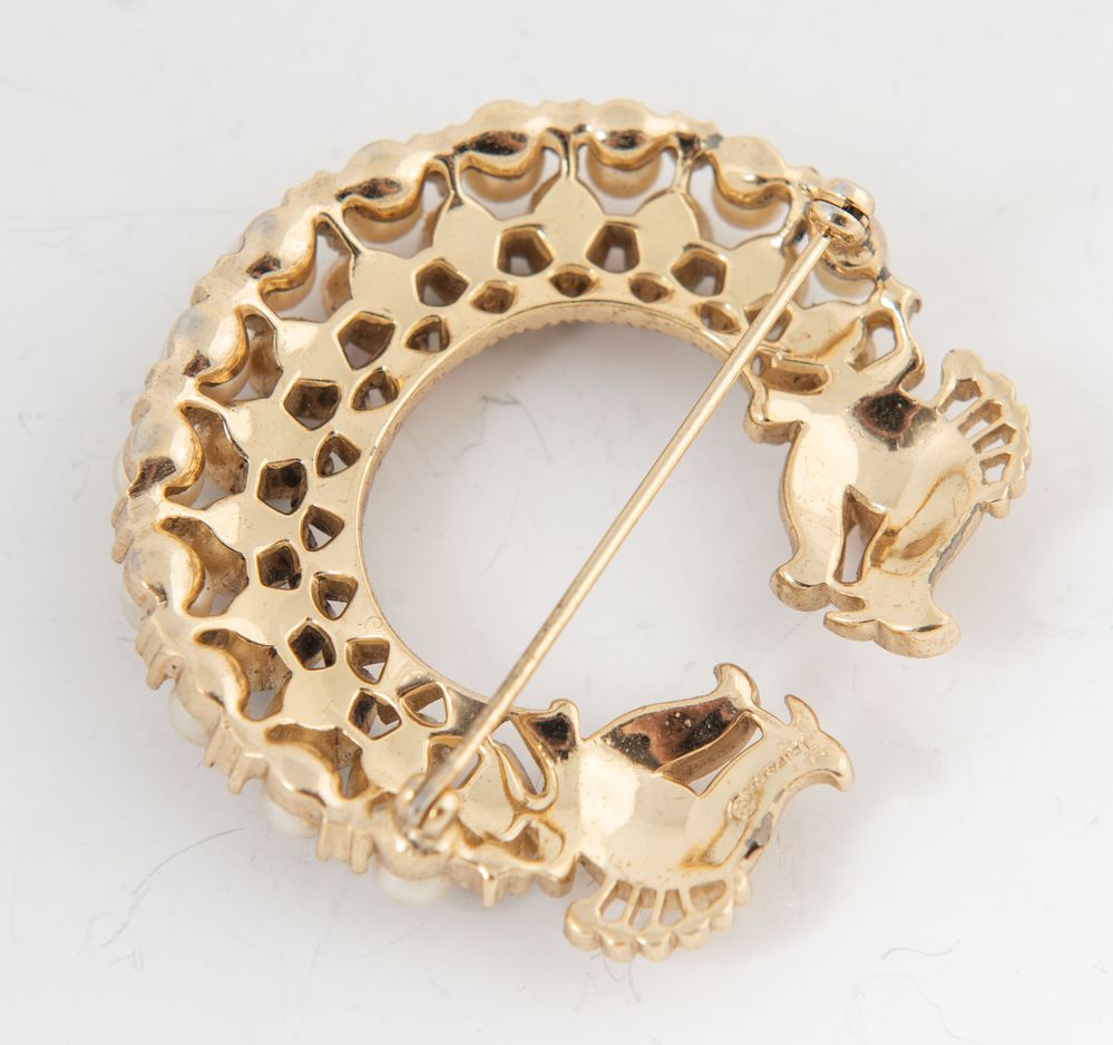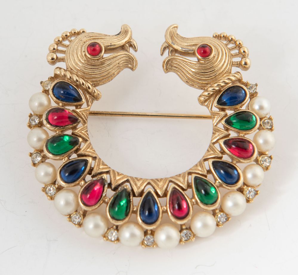 TRIFARI Spilla con richiamo mitologico in metallo dorato arricchita da pietre vitree colorate, perle sintetiche lavorate a cabochon e zirconi. Cm 4,5x5. Reca marchio Trifari. (Lievi difetti)