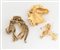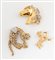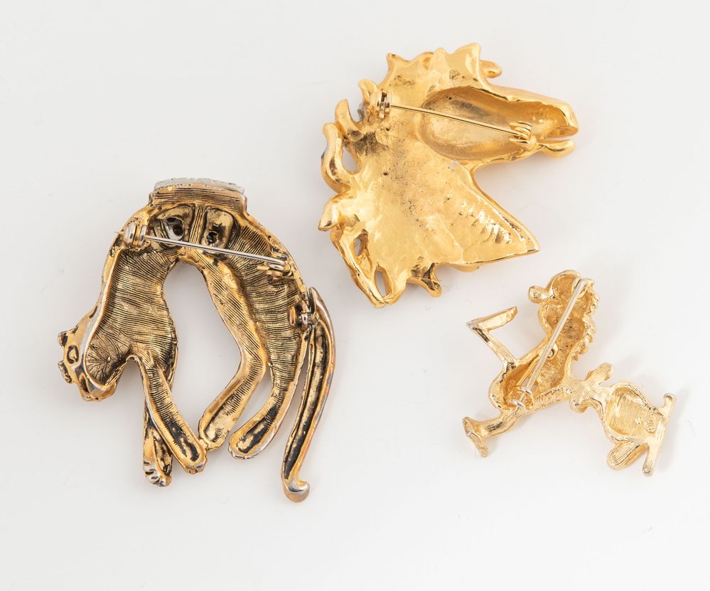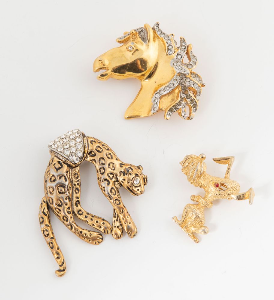 ANONIMO Lotto composto da tre spille a forma di animali realizzate in metallo dorato e arrichite da zirconi. Rispettivamente di misure: leopardo cm 5x4,5; cavallo cm 4x4,5; cane cm 3,7x3,5. (Difetti)