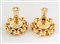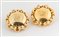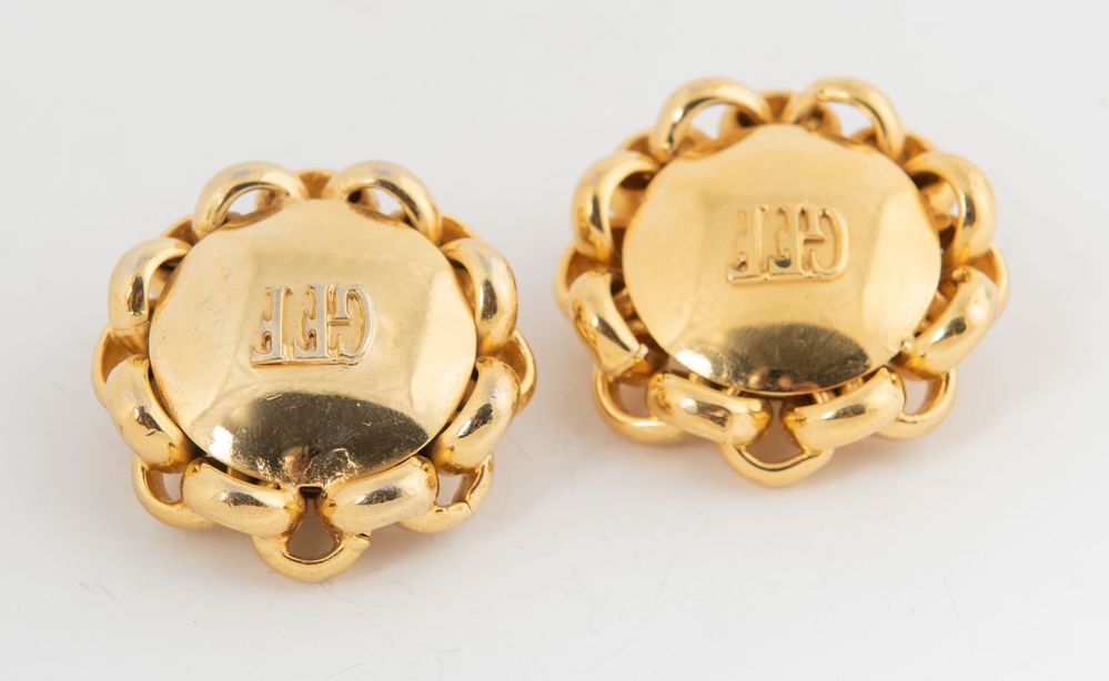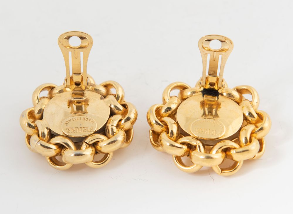 GIANFRANCO FERRÈ Orecchini a clip in metallo dorato centrati da logo. Anni '80. Diametro: cm 4 cad. Ciascuno reca marchio Ferre Made in Italy. (Lievi difetti)