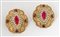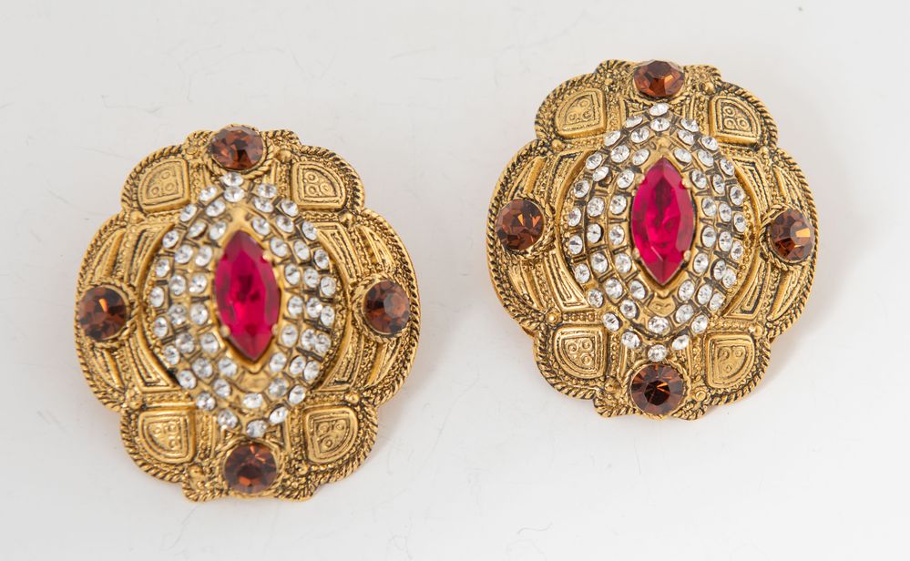 GIANFRANCO FERRÈ Orecchini a clip in metallo dorato e lavorato decorati con zirconi e pietre sintetiche rosse e color bronzo. Anni '80. Cm 5x4 cad. Ciascuno reca marchio Ferre Made in Italy. (Lievi difetti)