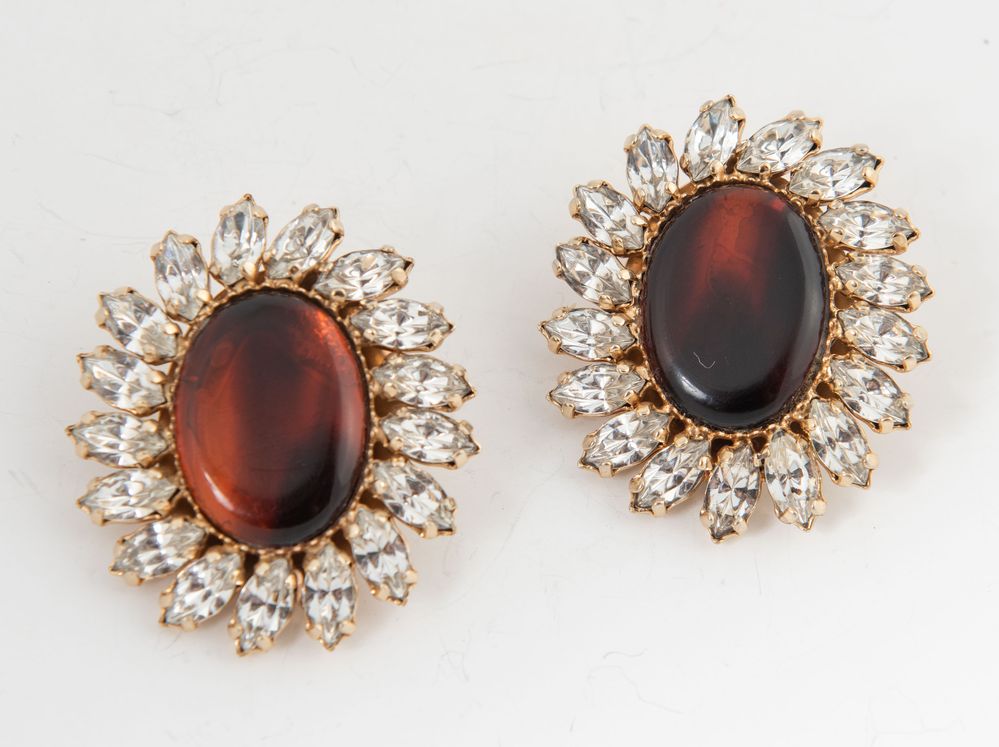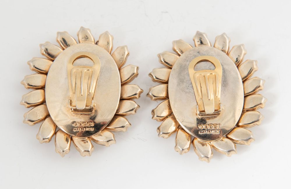 GUCCI Orecchini a clip in metallo dorato centrati da pietra vitrea ad imitazione della tartaruga con cornice di zirconi. Cm 4,5x4 cad. Ciascuno reca marchio Gucci Made in Italy. (Lievi difetti)