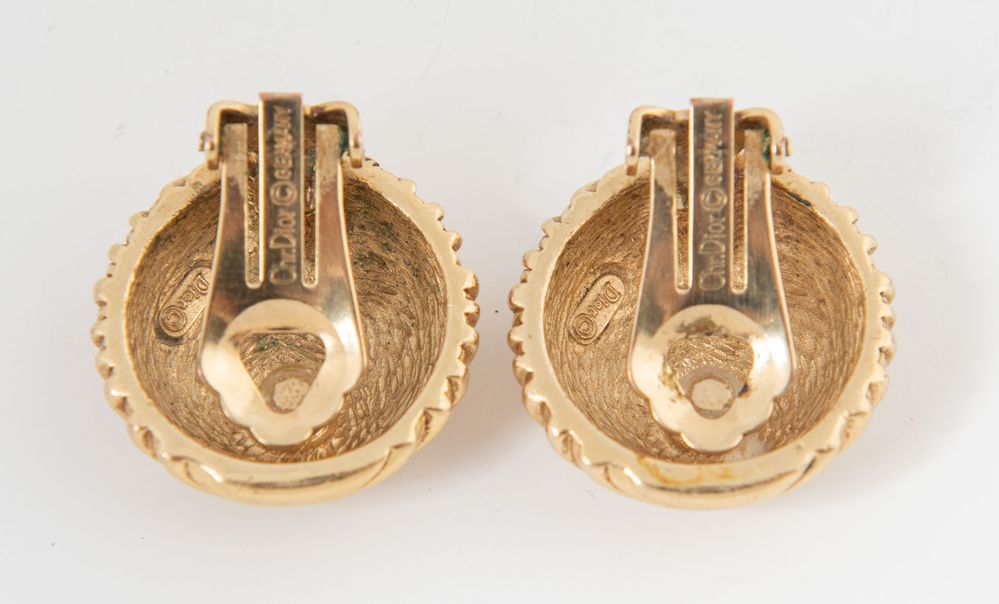 CHRISTIAN DIOR Orecchini a clip di forma sferica in metallo dorato e lavorato. Diametro: cm 2,2 cad. Ciascuno reca marchio Chr. Dior Gernany. (Lievi difetti)