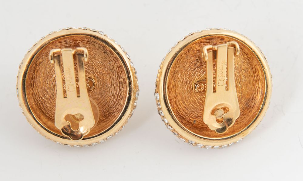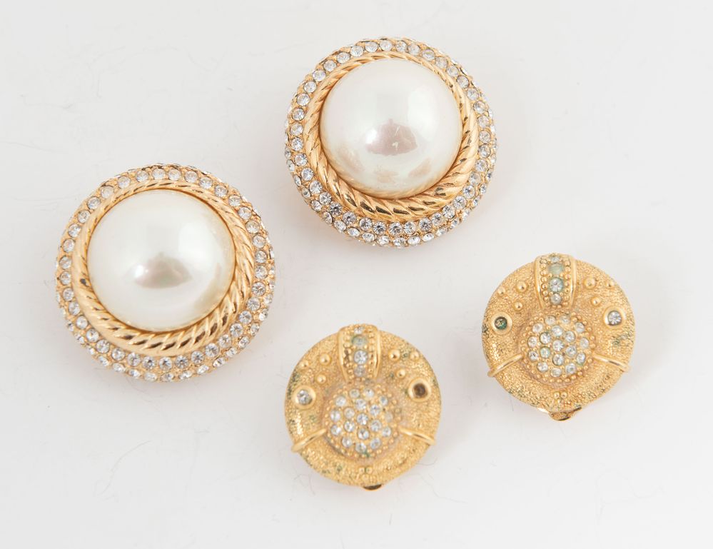 HENKEL GROSSE Lotto composto da due paia di orecchini a clip in metallo dorato arricchiti da perle sintetiche e zirconi. Rispettimente di misure: diametro cm 3 cad., diametro cm 2 cad. Ciascuno reca marchio Grosse. (Difetti)