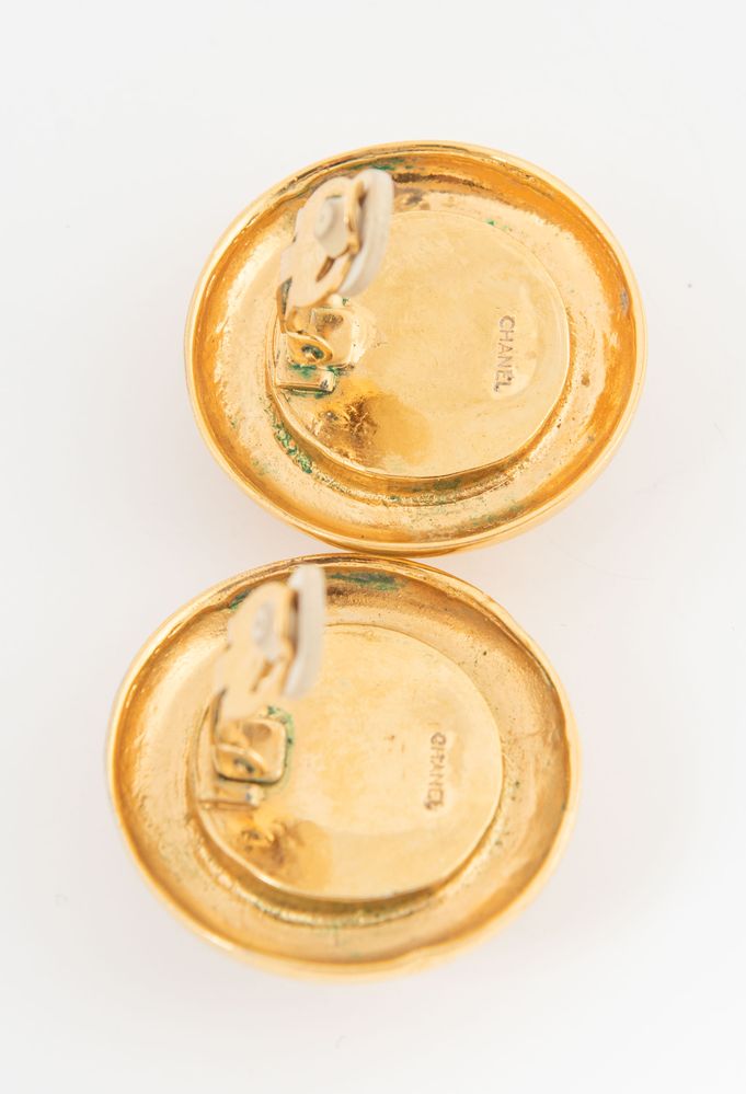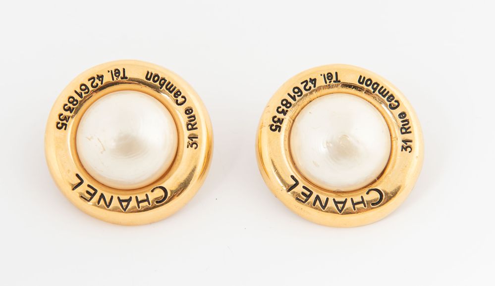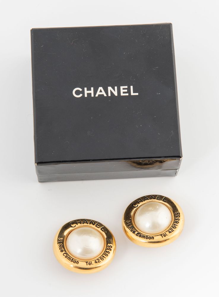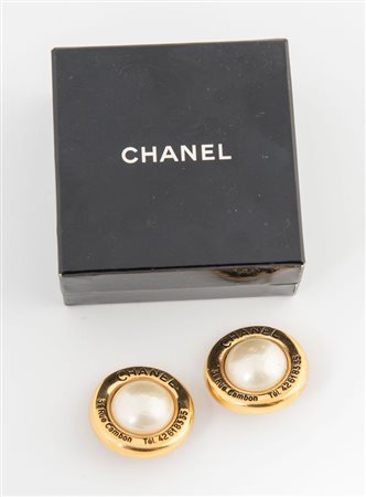 CHANEL Orecchini a clip in metallo dorato centrati da perla sintetica. Anni '80/'90. Diametro: cm 3,5 cad. Sul lato frontale recano marchi Chanel 31 Rue Cambon Tel. 42618335. Sul retro recano marchio Chanel. Corredati di scatola originale. (Lievi difetti)