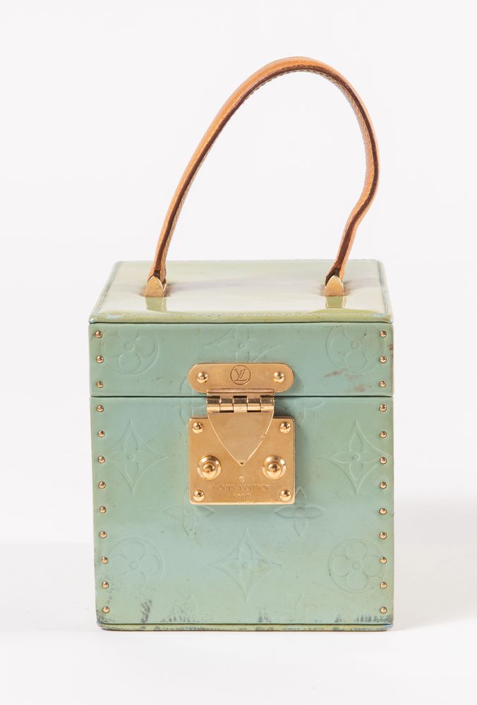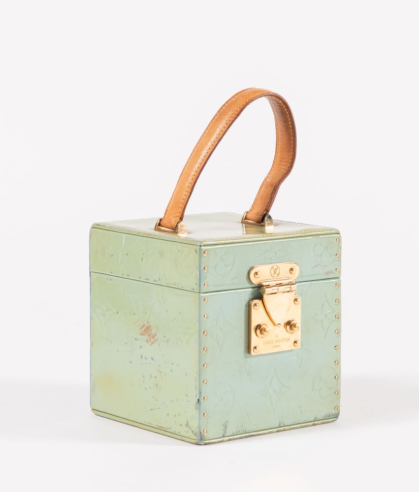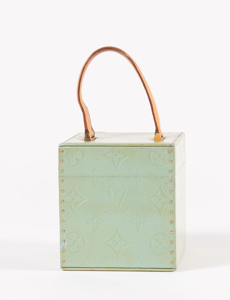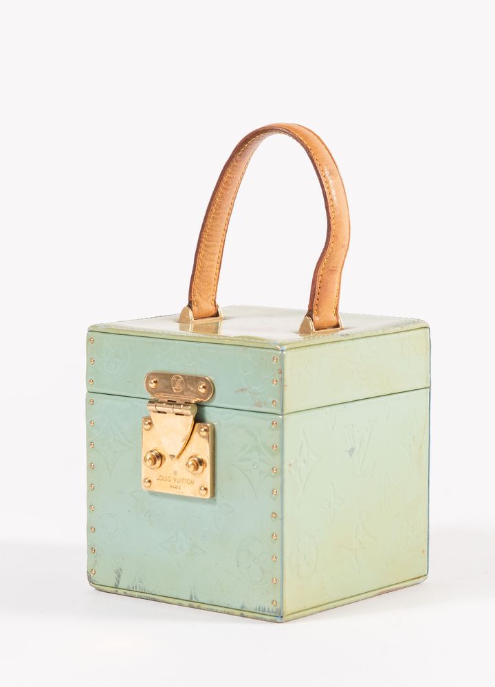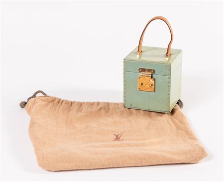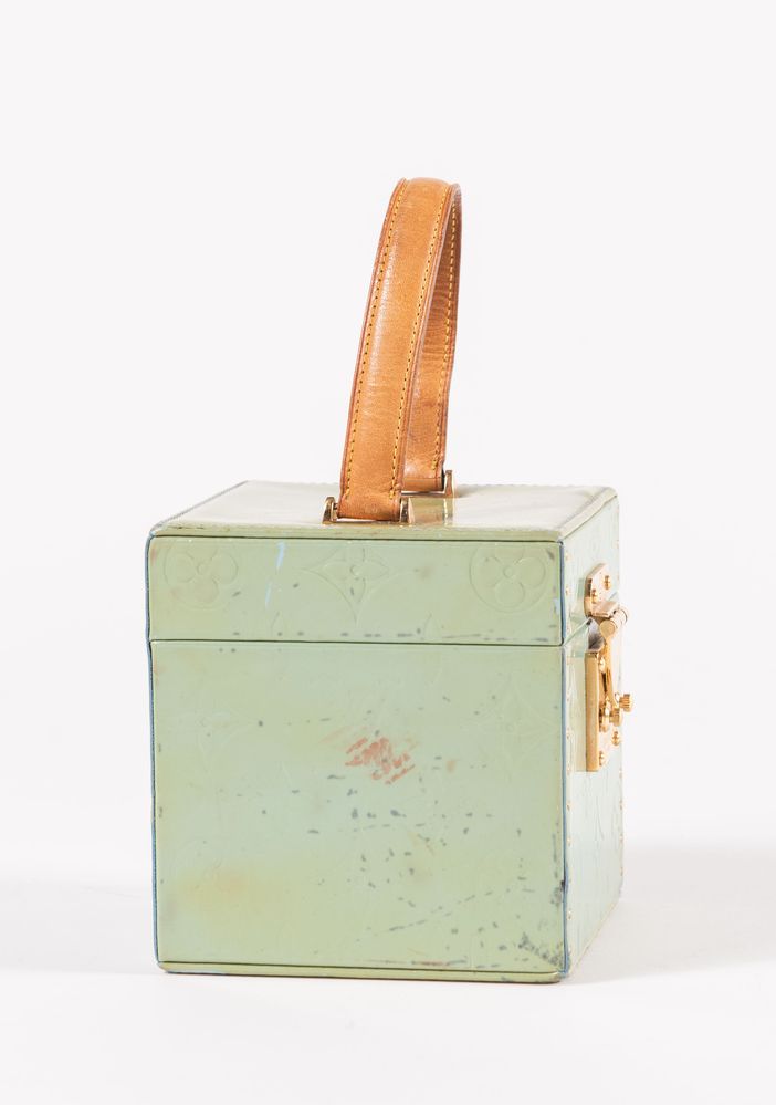 LOUIS VUITTON Borsa a mano modello Bleeker box in tela monogram vernis color menta con manico in cuoio e dettagli in metallo dorato. Anno 1999. Cm 12x11x11. Altezza con manico cm: 23. Interno rivestito in pelle con annesso specchietto incastonato nella parte superiore. Reca marchi LV, Made in France, Louis Vuitton Paris, Louis Vuitton Paris Made in France e codice di riferimento prodotto. Corredato di dustbag originale. (Difetti)