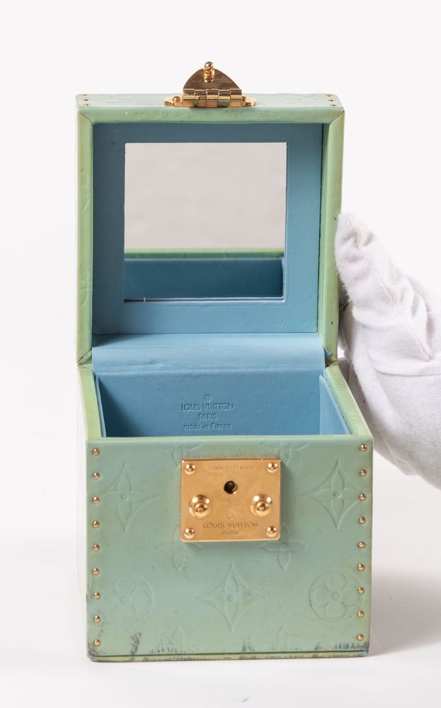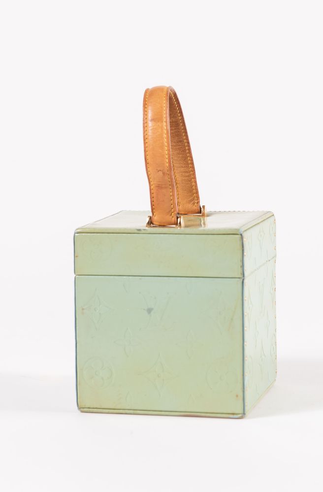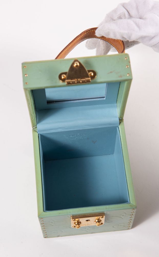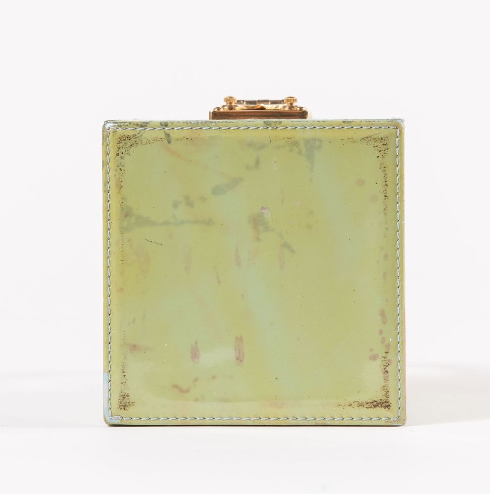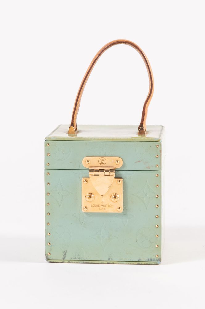 LOUIS VUITTON Borsa a mano modello Bleeker box in tela monogram vernis color menta con manico in cuoio e dettagli in metallo dorato. Anno 1999. Cm 12x11x11. Altezza con manico cm: 23. Interno rivestito in pelle con annesso specchietto incastonato nella parte superiore. Reca marchi LV, Made in France, Louis Vuitton Paris, Louis Vuitton Paris Made in France e codice di riferimento prodotto. Corredato di dustbag originale. (Difetti)