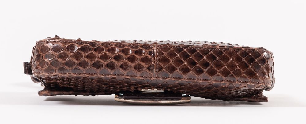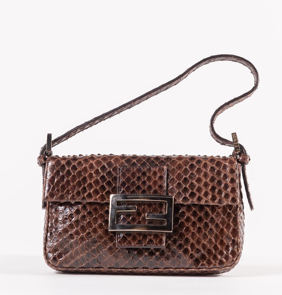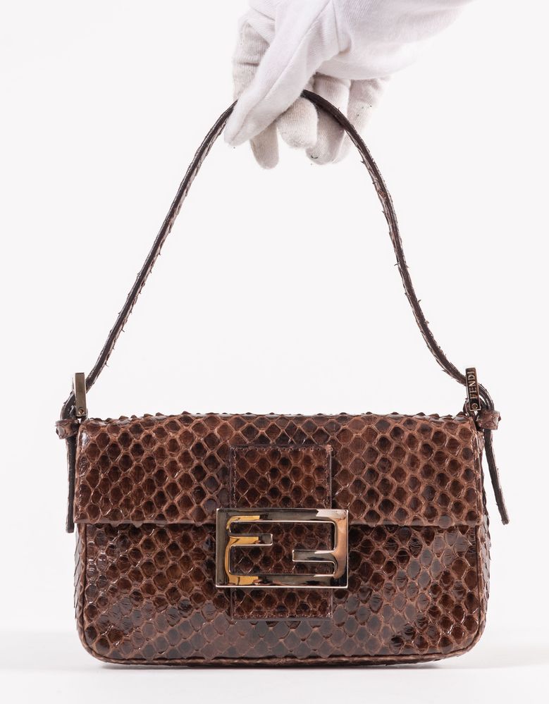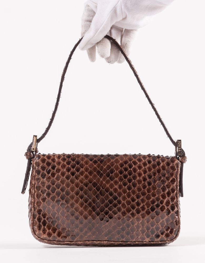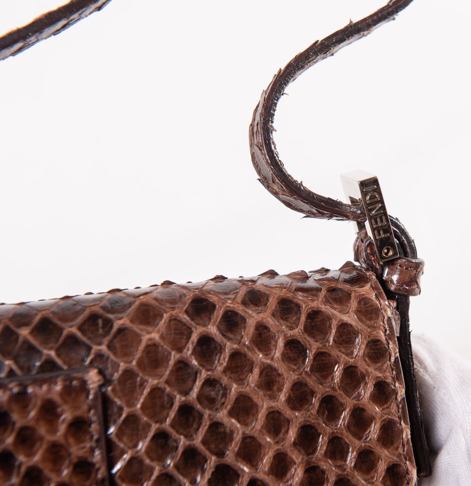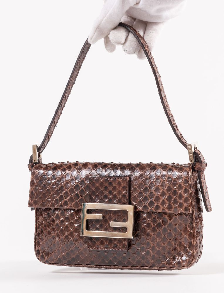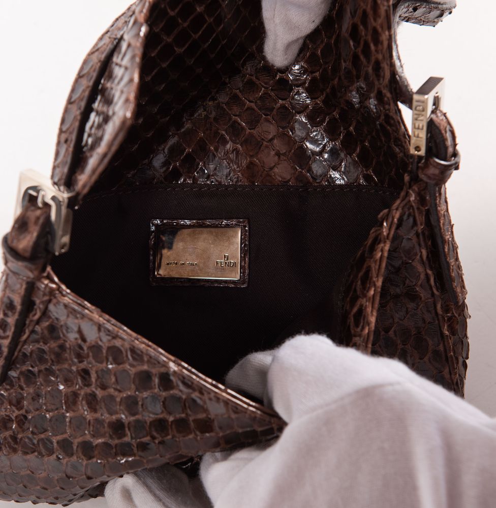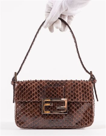 FENDI Borsa modello Baguette mini in pelle di pitone marrone con dettagli in metallo argentato. Cm 12x19x3. Altezza con manico: cm 27. Interno rifinito in tela marrone. Reca marchi FF, Fendi, Fendi Made in Italy.