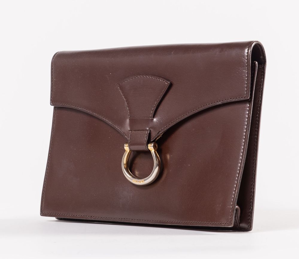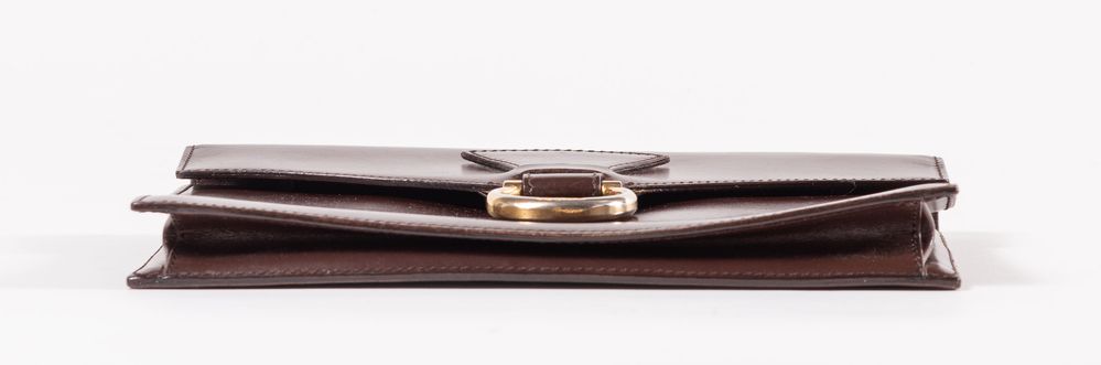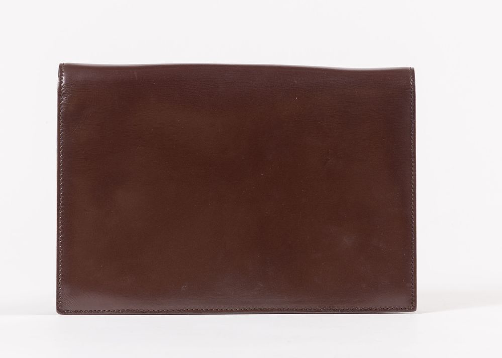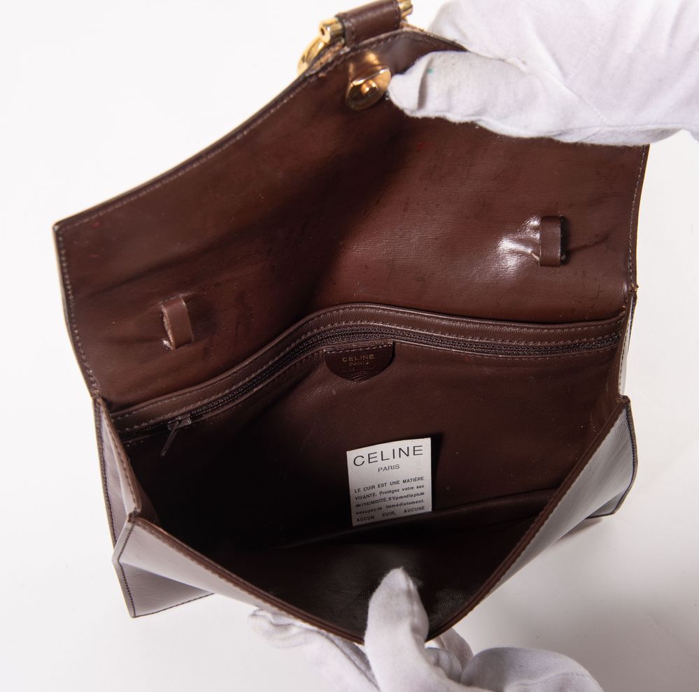 CELINE Borsa a mano in pelle liscia marrone con dettaglio della chiusura in metallo dorato. Cm 17,5x24,5x4. Interno rifinito in pelle con due vani porta oggetti e una tasca chiusa da cerniera. Reca marchi Celine, Celine Paris Made in Italy e codice di riferimento prodotto. (Difetti e mancanze)