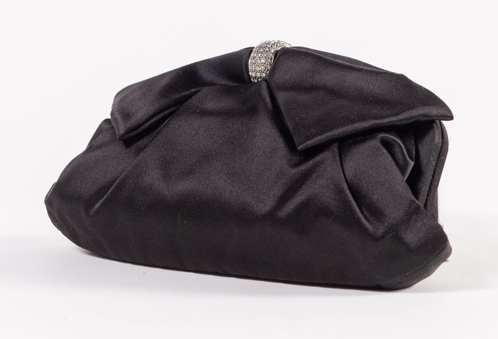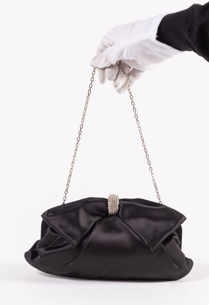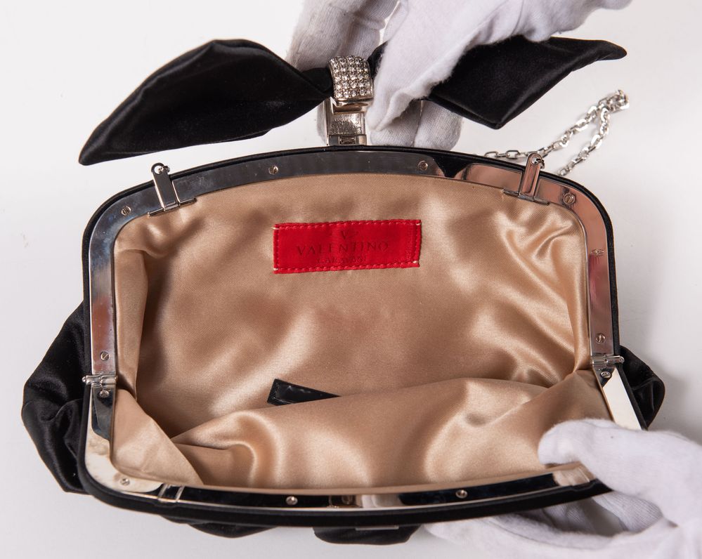 VALENTINO GARAVANI Borsa da sera in seta nera con chiusura a scatto arricchita da swaroski e manico a catena in metallo argentato. Cm 13,5x24x4. Interno rifinito in seta beige. Reca marchi V, Valentino Garavani. (Lievi difetti)