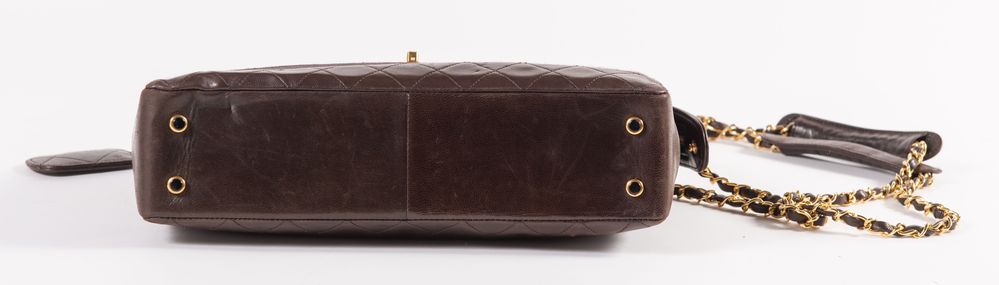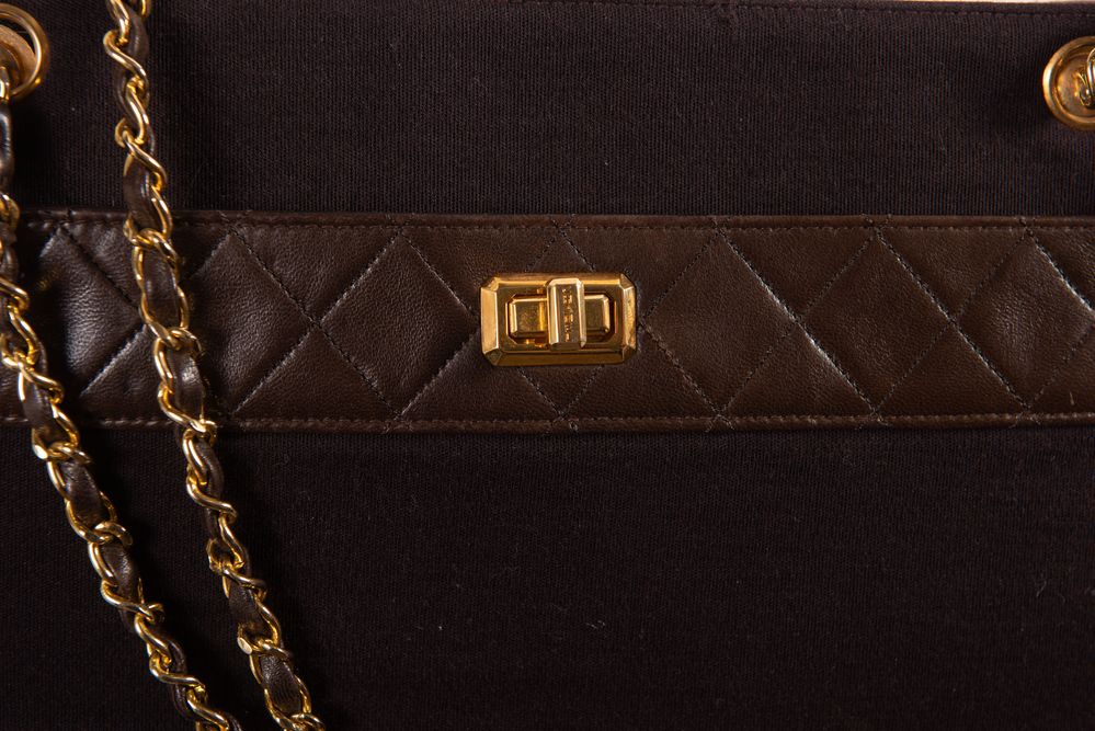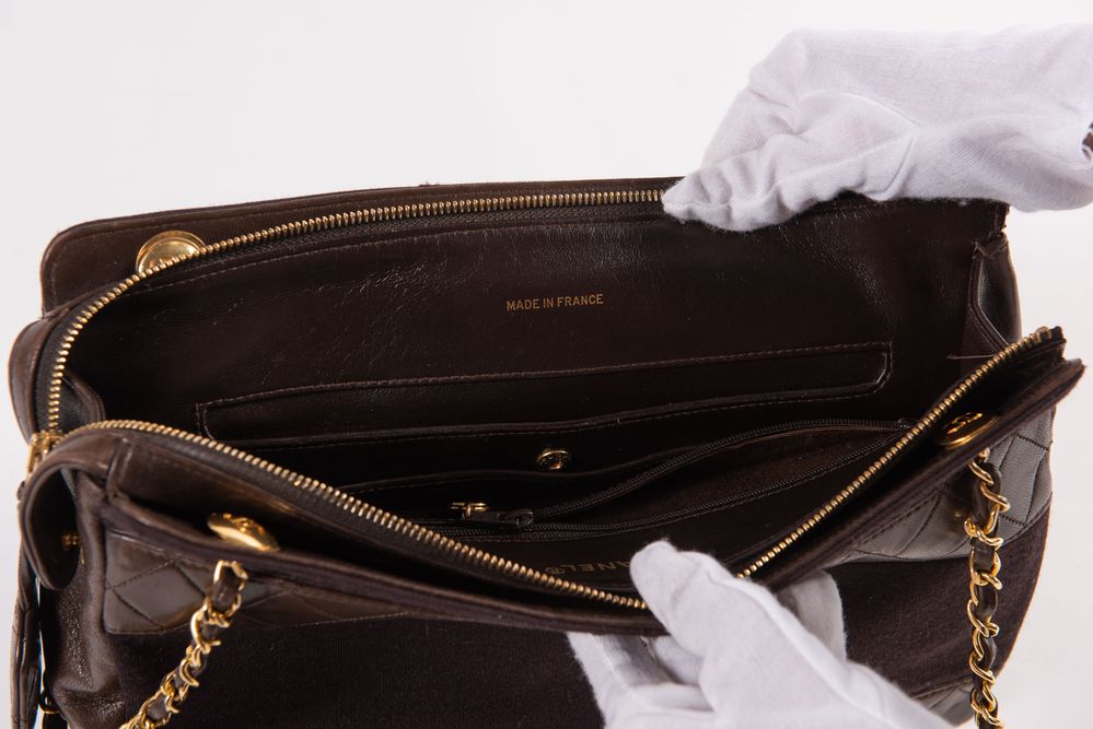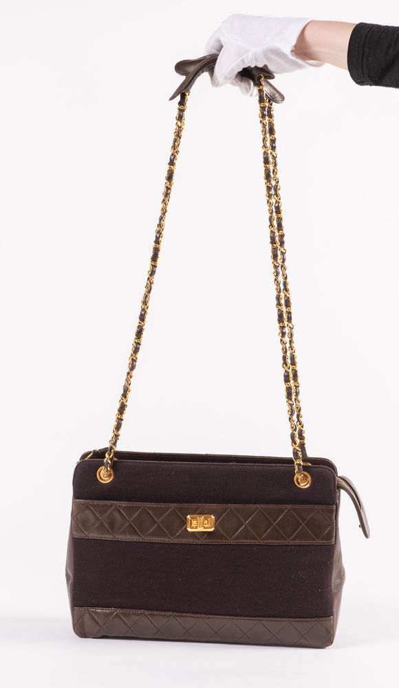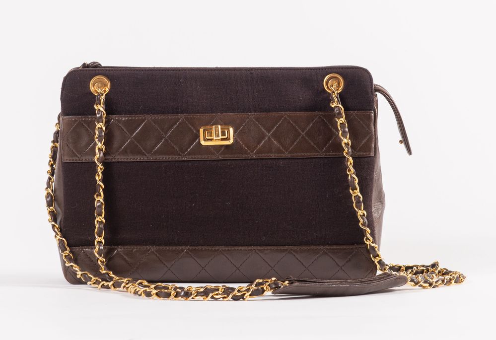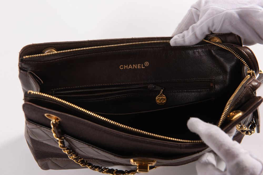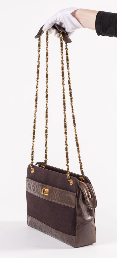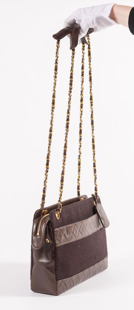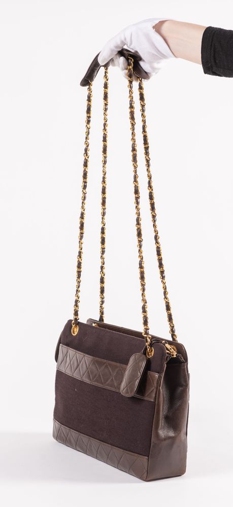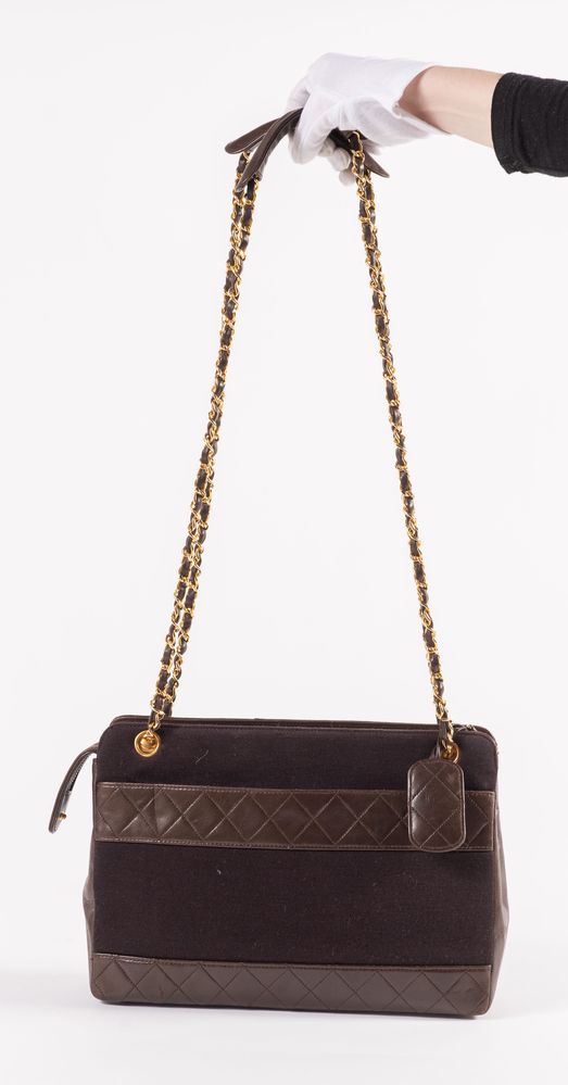 CHANEL Borsa da spalla in tela e pelle trapuntata marrone con dettagli e rifiniture in metallo dorato. Su entrambi i lati esterni reca una tasca portaoggetti. Anni '80. Cm 21x33x8. Altezza con manico: cm 63. Interno rifinito in pelle con tre vani porta oggetti e tre tasche di cui una chiusa da cerniera. Reca marchio CC, Chanel, Made in France. (Difetti)