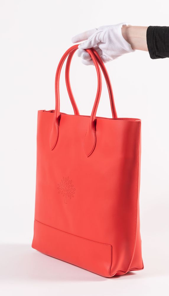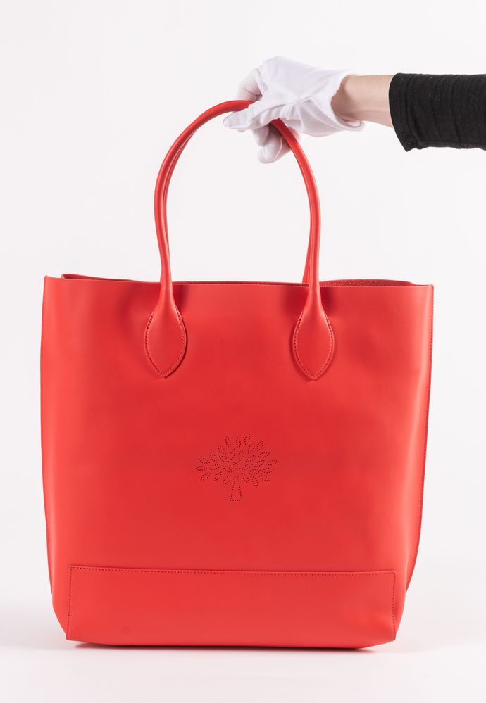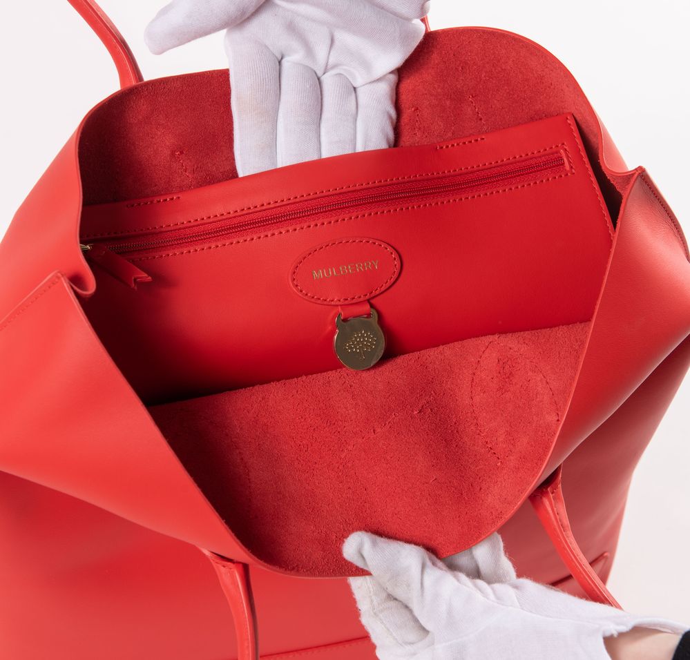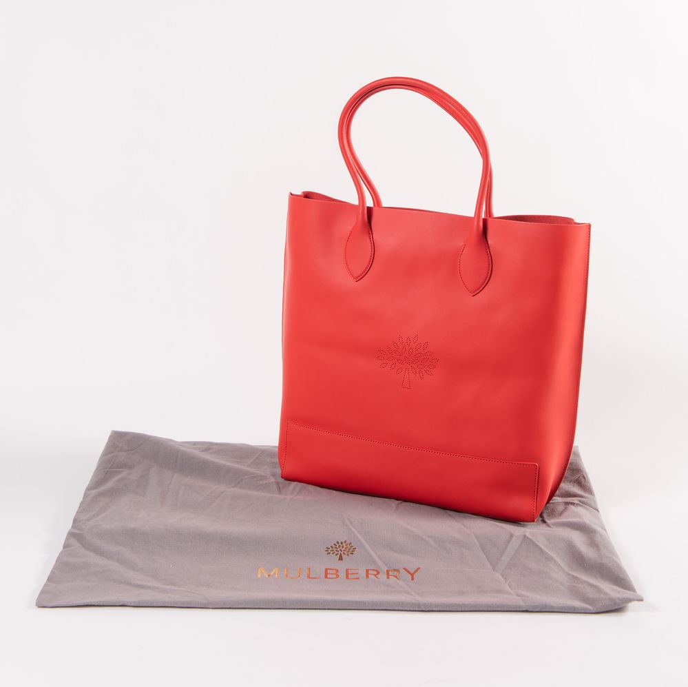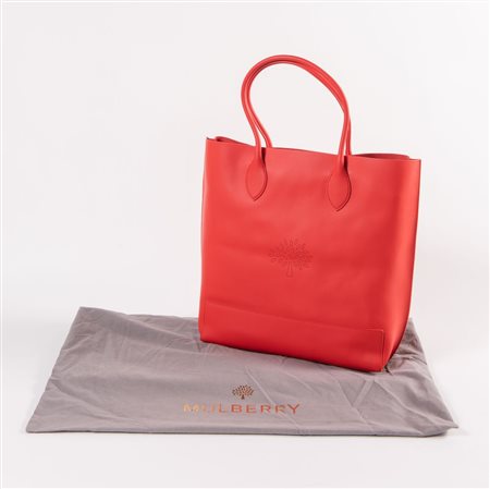 MULBERRY Borsa da spalla in pelle rossa con logo traforato centrale. Cm 37x37x9. Altezza con manico : cm 54. Interno rifinito in camoscio con una tasca porta oggetti chiusa da cerniera. Corredata di certificato e dustbag originale.