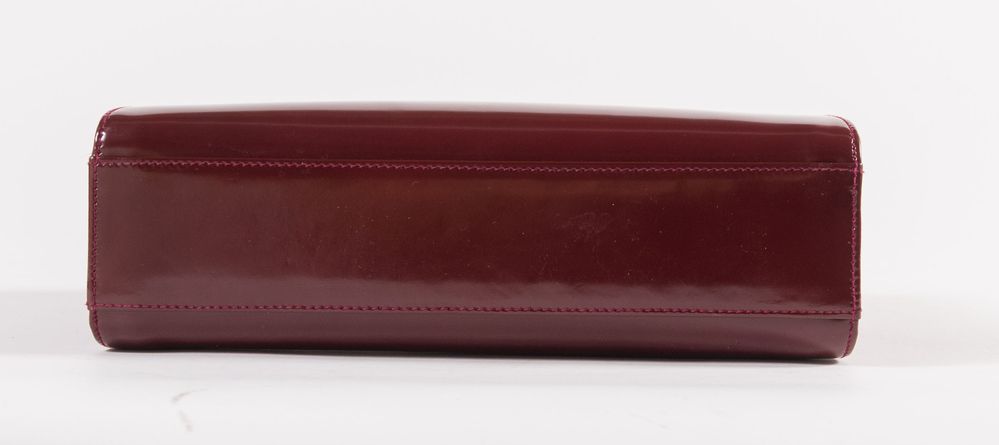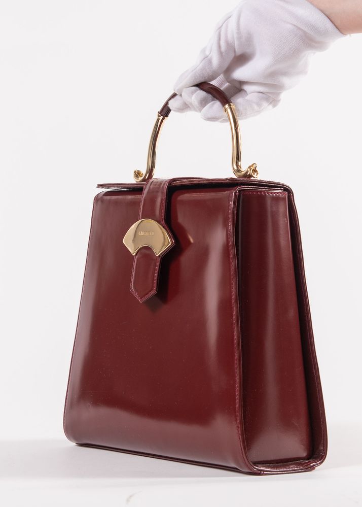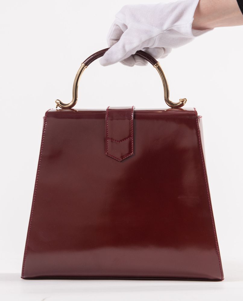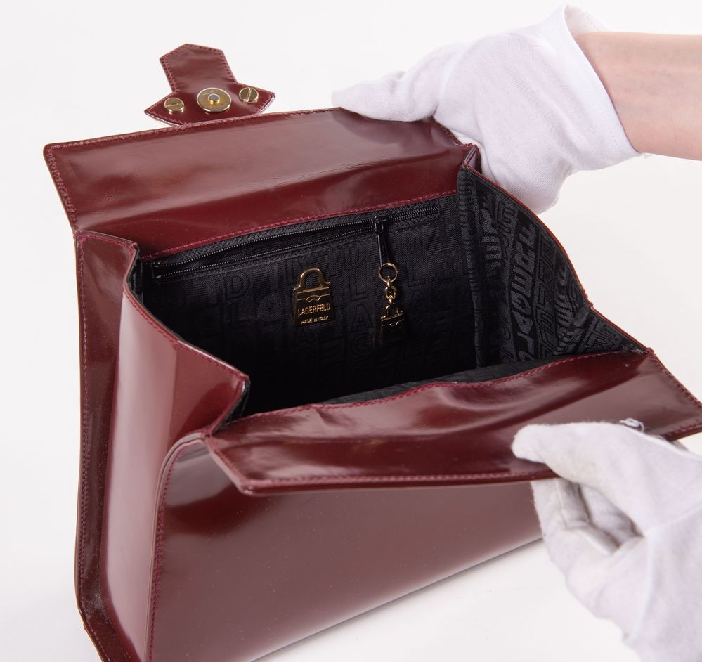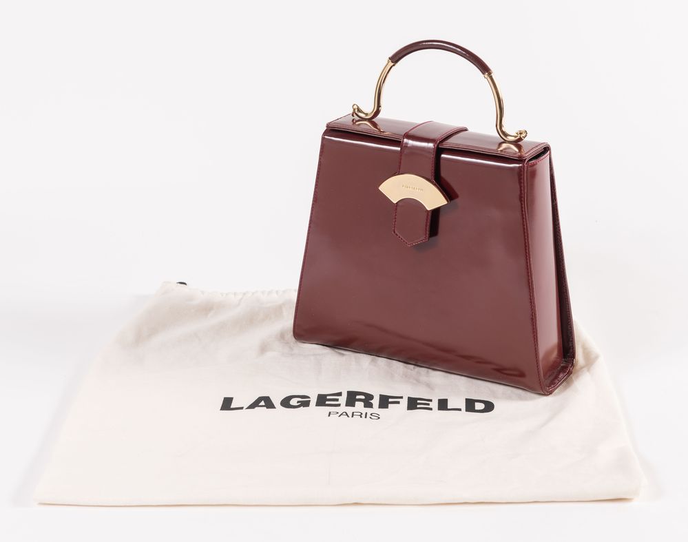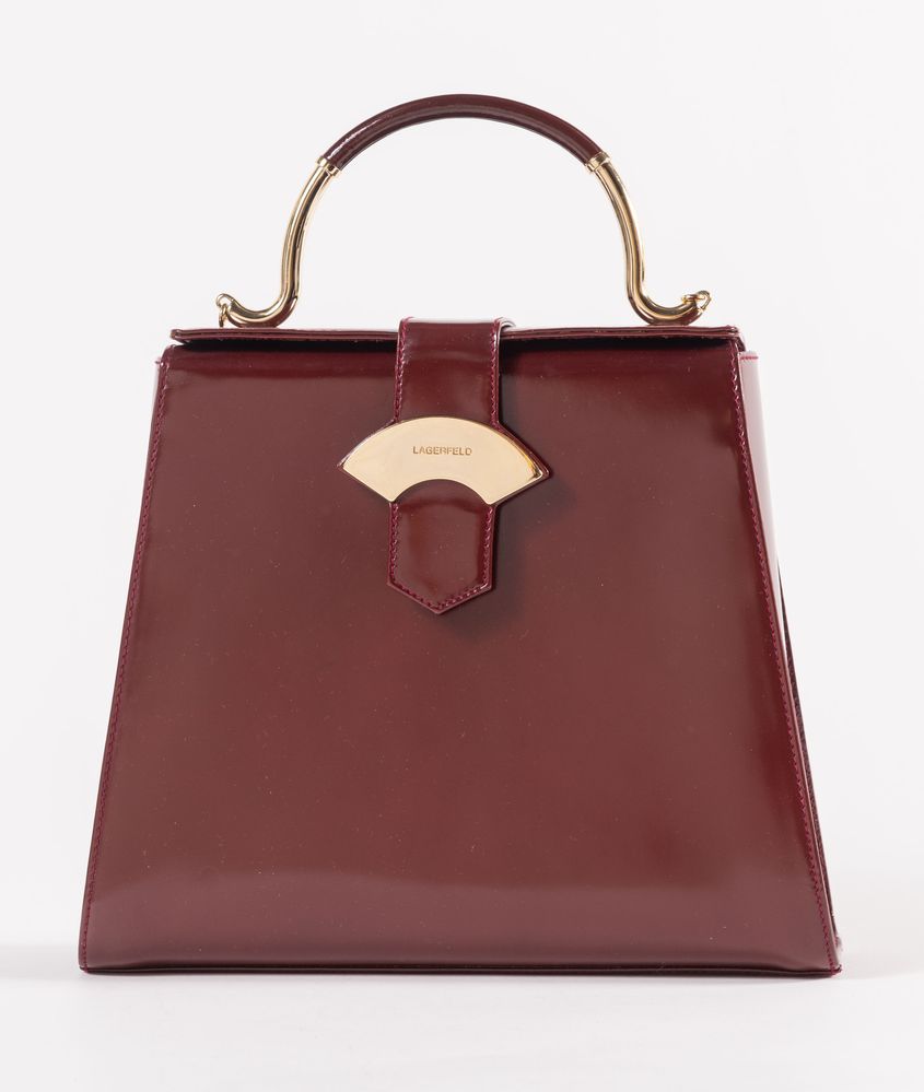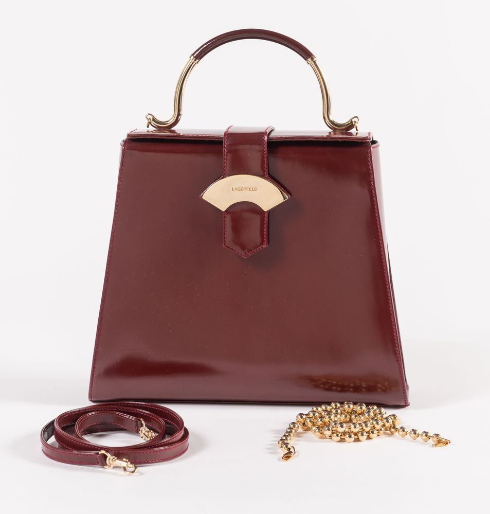 KARL LAGERFELD Borsa a mano modello Ostrich Kelly in pelle liscia bordeaux con dettagli in metallo dorato. Anni '90. Cm 22x26x7. Altezza con manico: cm 33. Corredata di due tipologie di tracolle, una in pelle e una in metallo dorato, ciascuna di cm 105. Interno rifinito in tela logata nera con una tasca chiusa da cerniera. Reca marchi Lagerfeld, Lagerfeld Made in Italy. Corredata di dustbag originale. (Lievi difetti)