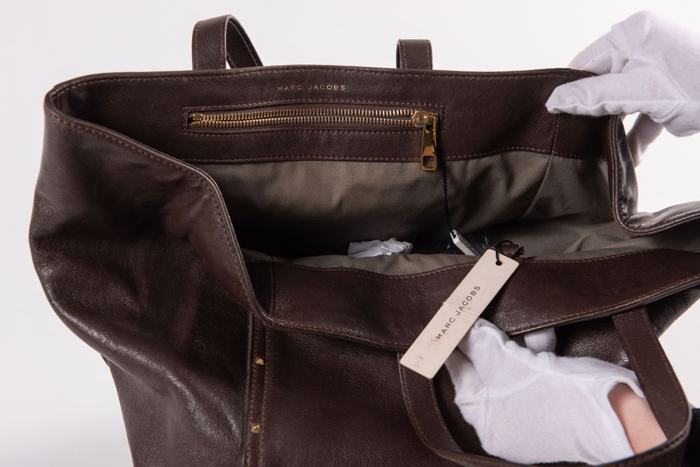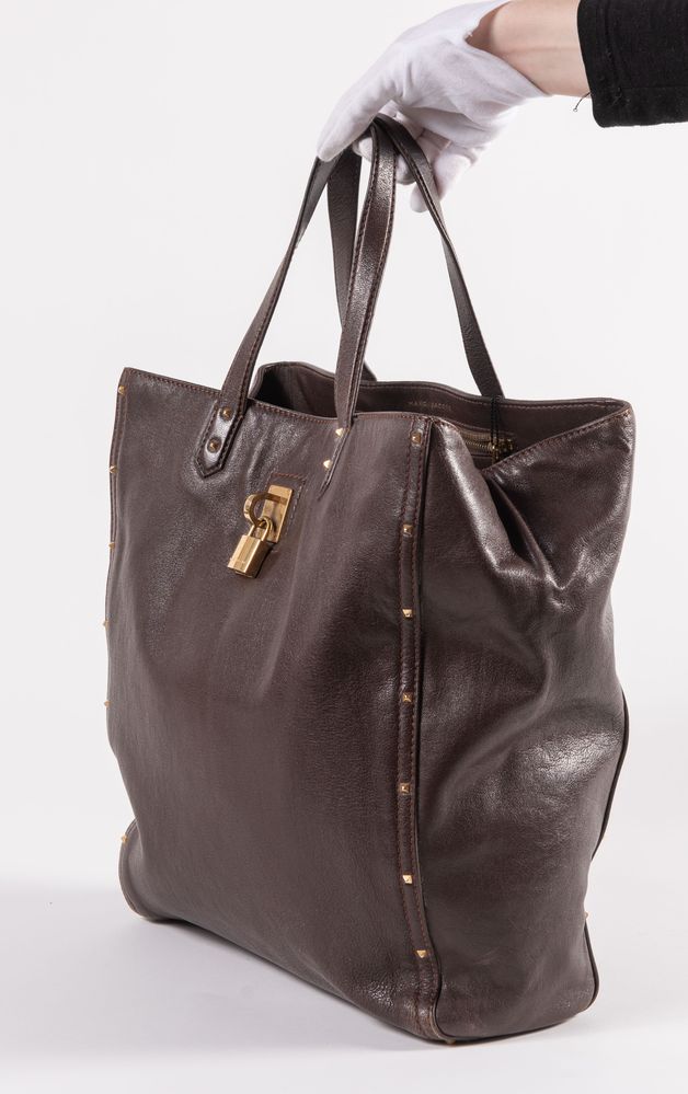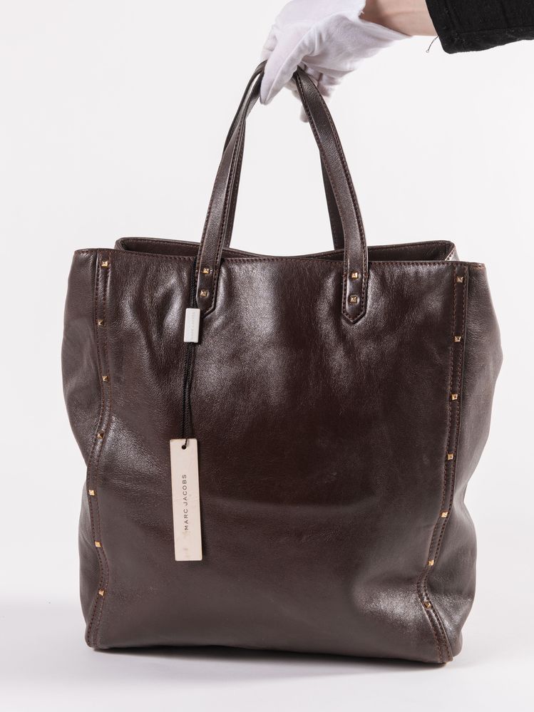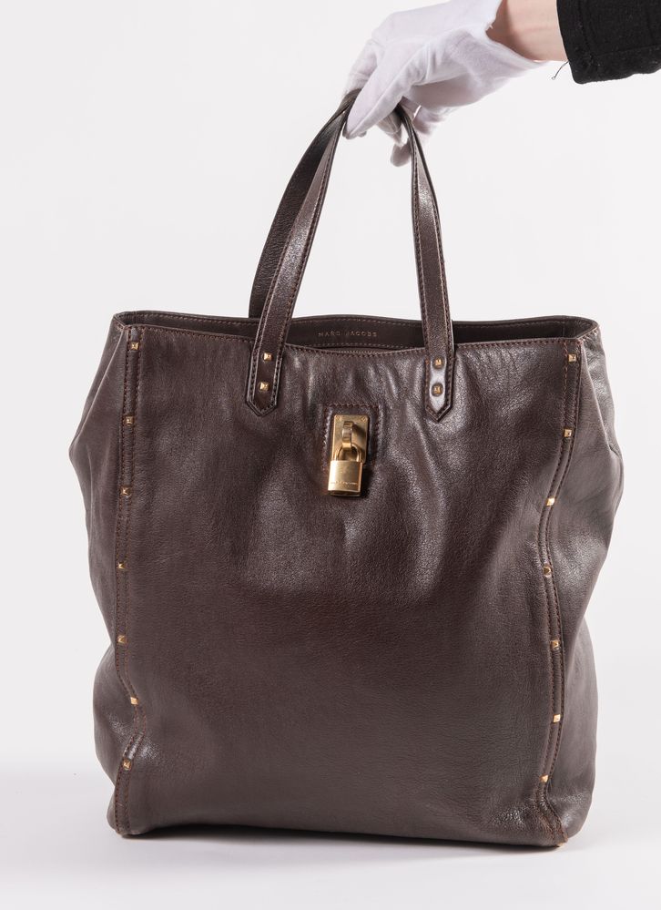 MARC JACOBS Borsa da spalla modello Gramercy in pelle marrone con dettagli in metallo dorato. Cm 34x36x8. Altezza con manico: cm 55. Interno rifinito in tela con anello portachiavi e due tasche di cui una chiusa da cerniera. Reca marchi Marc Jacobs. Accompagnata da cartellino originale con riferimento di modello. (Difetti)