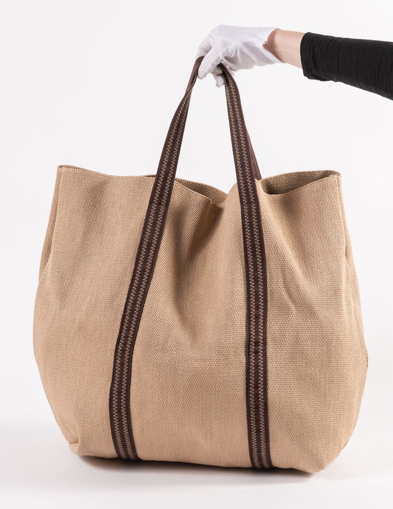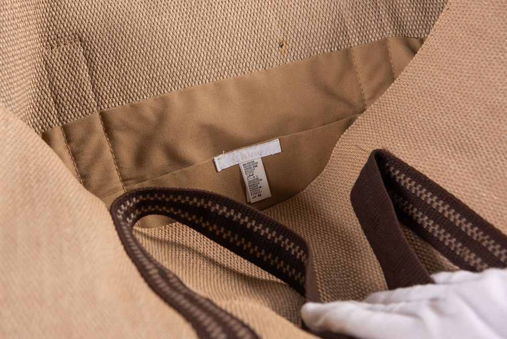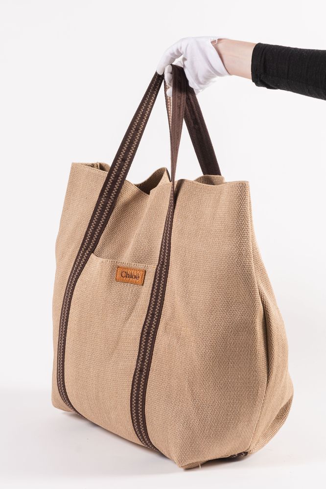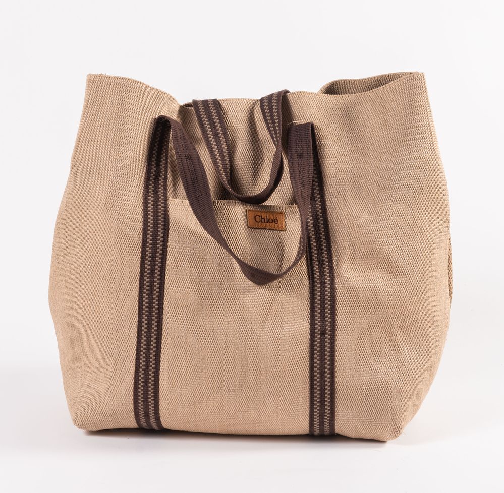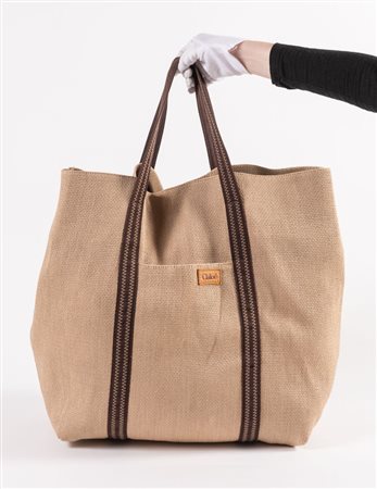 CHLOÉ Borsa da spalla in rafia trattata con manici e rifiniture in corda di cotone color marrone. Cm 55X51X4. Altezza con manico cm: 74. Composizione: 88% viscosa, 12% cotone. Sul lato frontale presenta una tasca porta oggetti. Interno rifinito in tela con una tasca porta oggetti. Reca marchio Chloé ed etichetta Chloé Made in Italy. (Lievi difetti)
