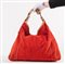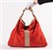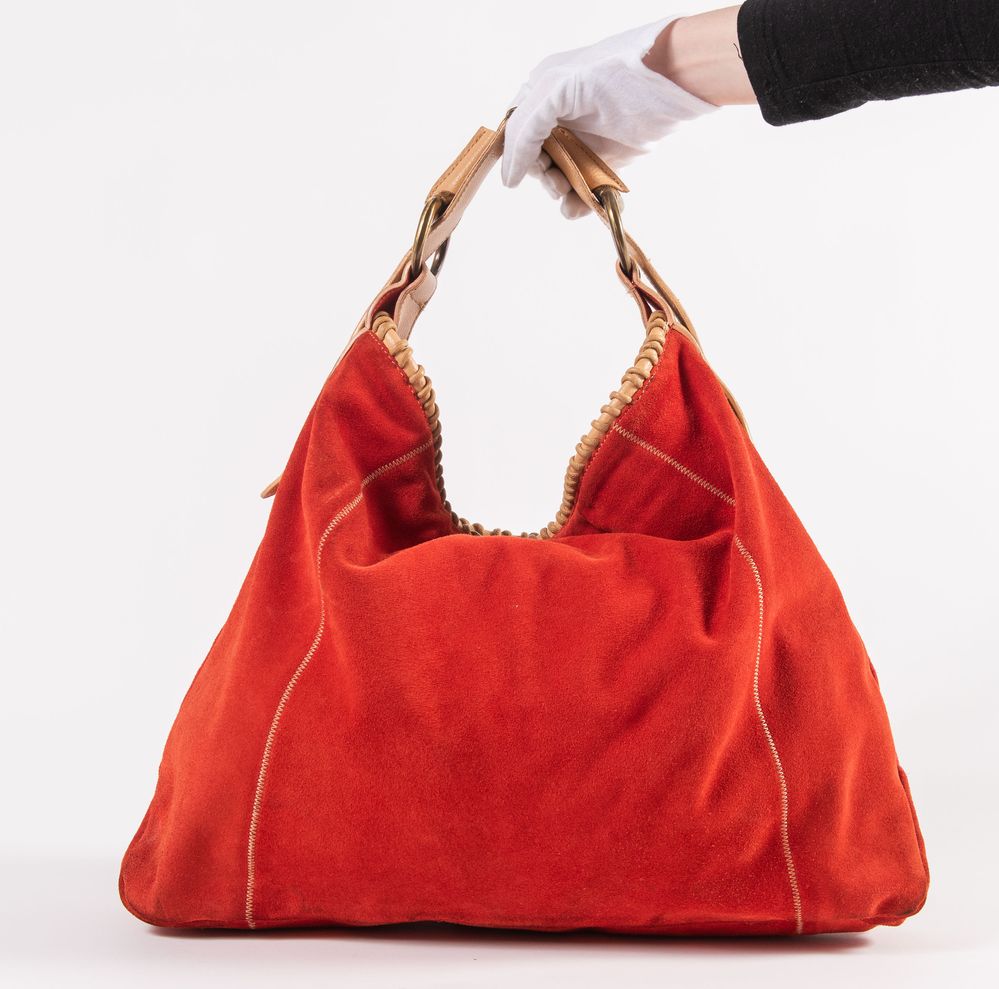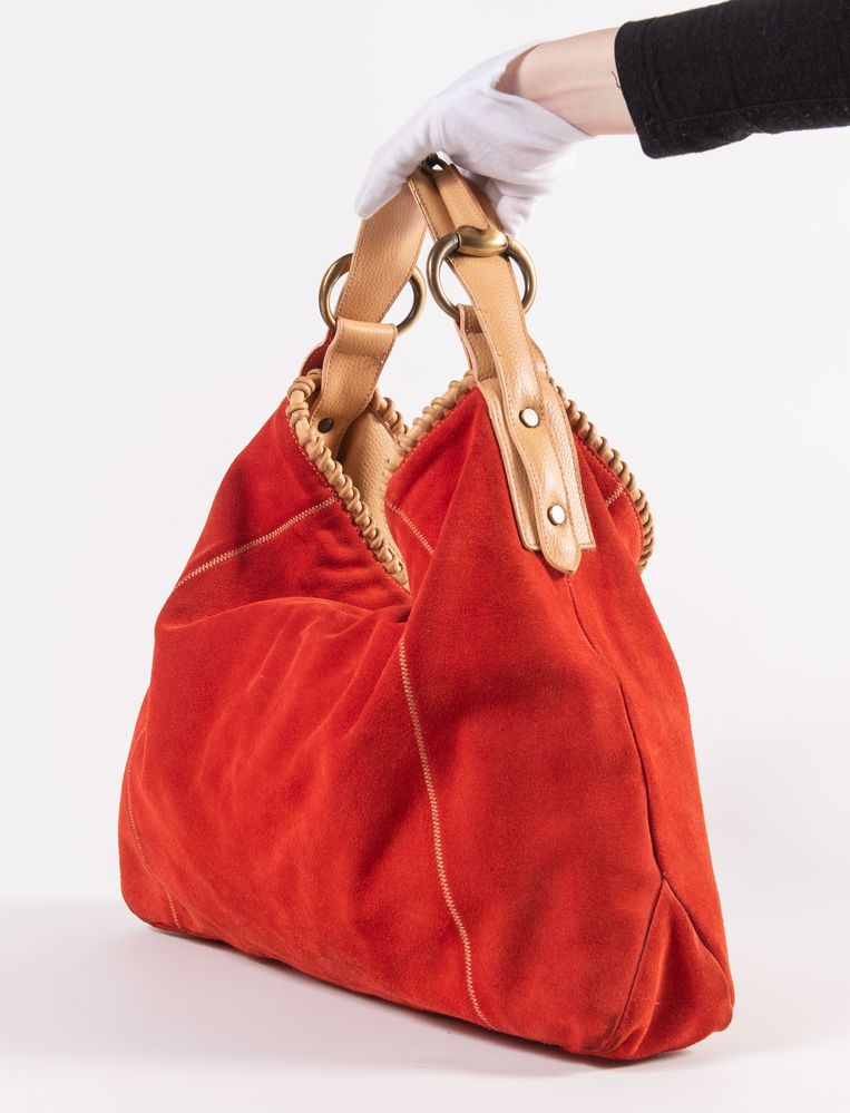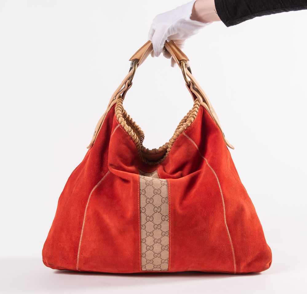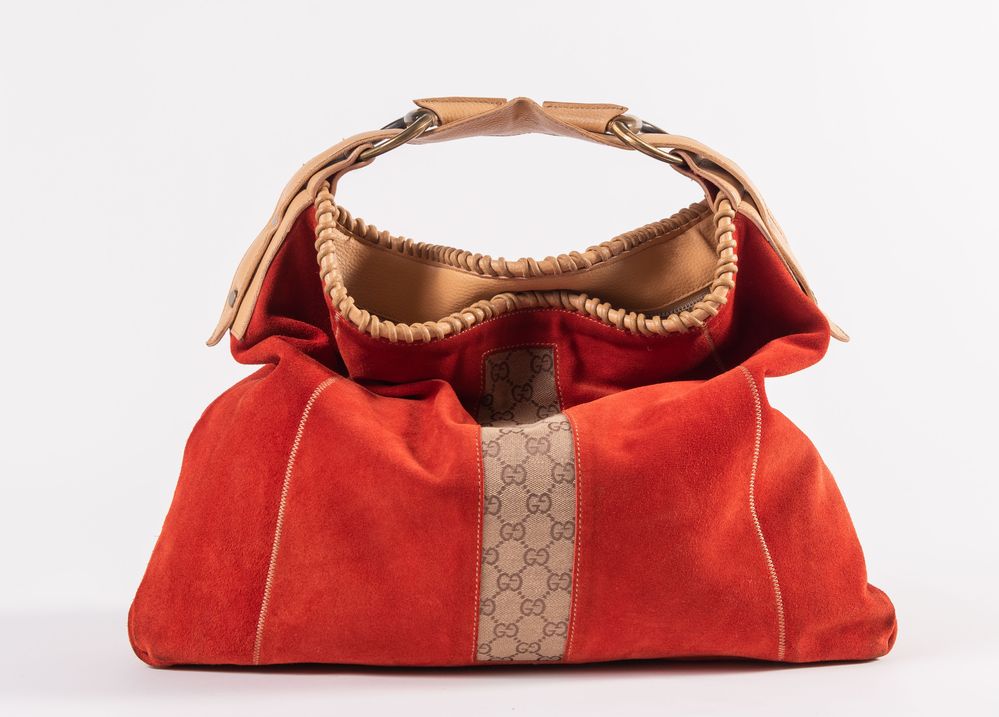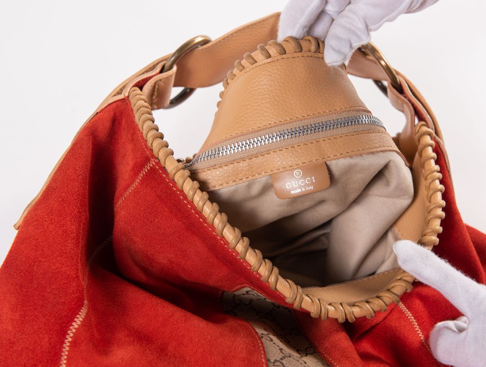 GUCCI Borsa da spalla in camoscio rosso con rifiniture in pelle beige, fascia centrale in tela monogram e dettagli in metallo dorato. Cm 52x45x10,5. Interno rifinito in tela con una tasca chiusa da cerniera. Reca marchi GG, Gucci Made in Italy. (Difetti)