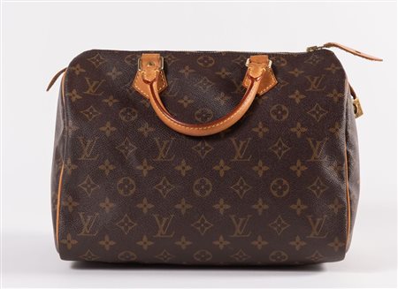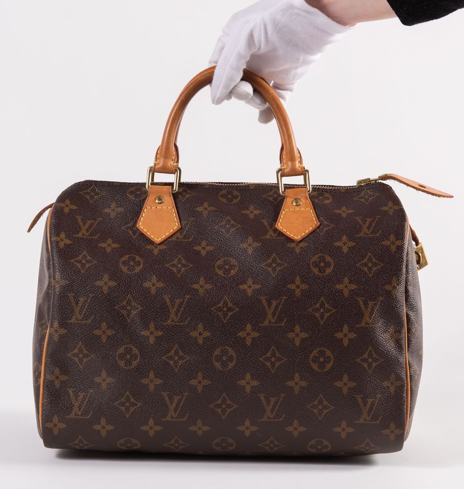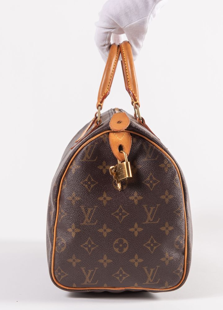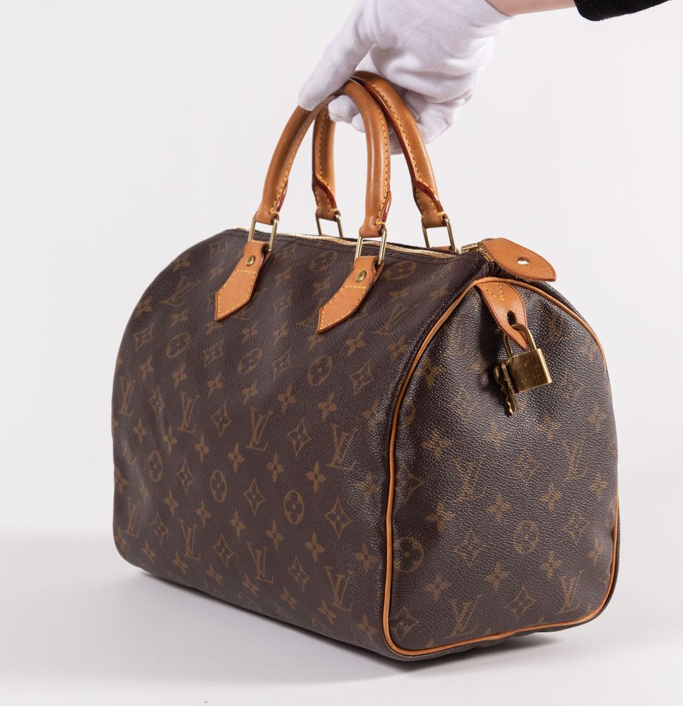 LOUIS VUTTON Borsa a bauletto modello Speedy 30 in tela monogram con rifiniture in cuoio e dettagli in metallo dorato. Cm 26x31x18. Altezza con manici: cm 32. Interno rifinito in tela con una tasca porta oggetti. Reca marchi LV, Louis Vuitton, Louis Vuitton Paris Made in France e codice di riferimento prodotto. Corredato di lucchetto e chiave originale. (Difetti)
