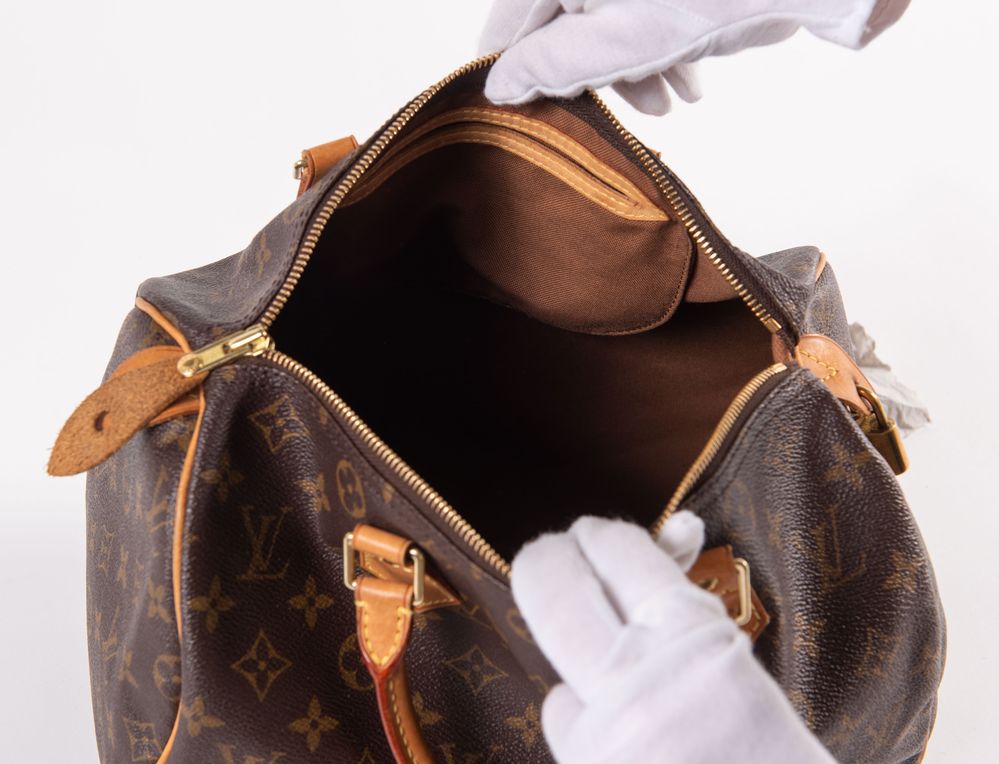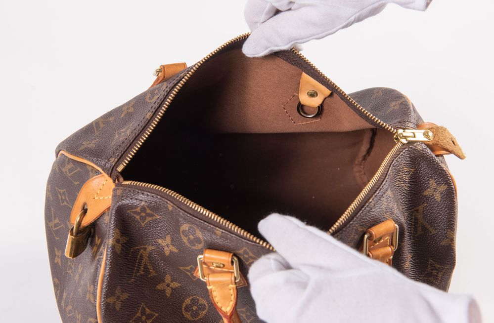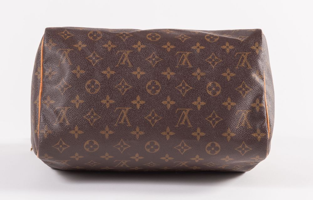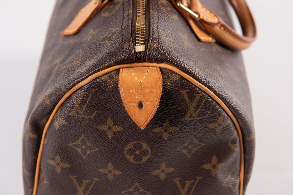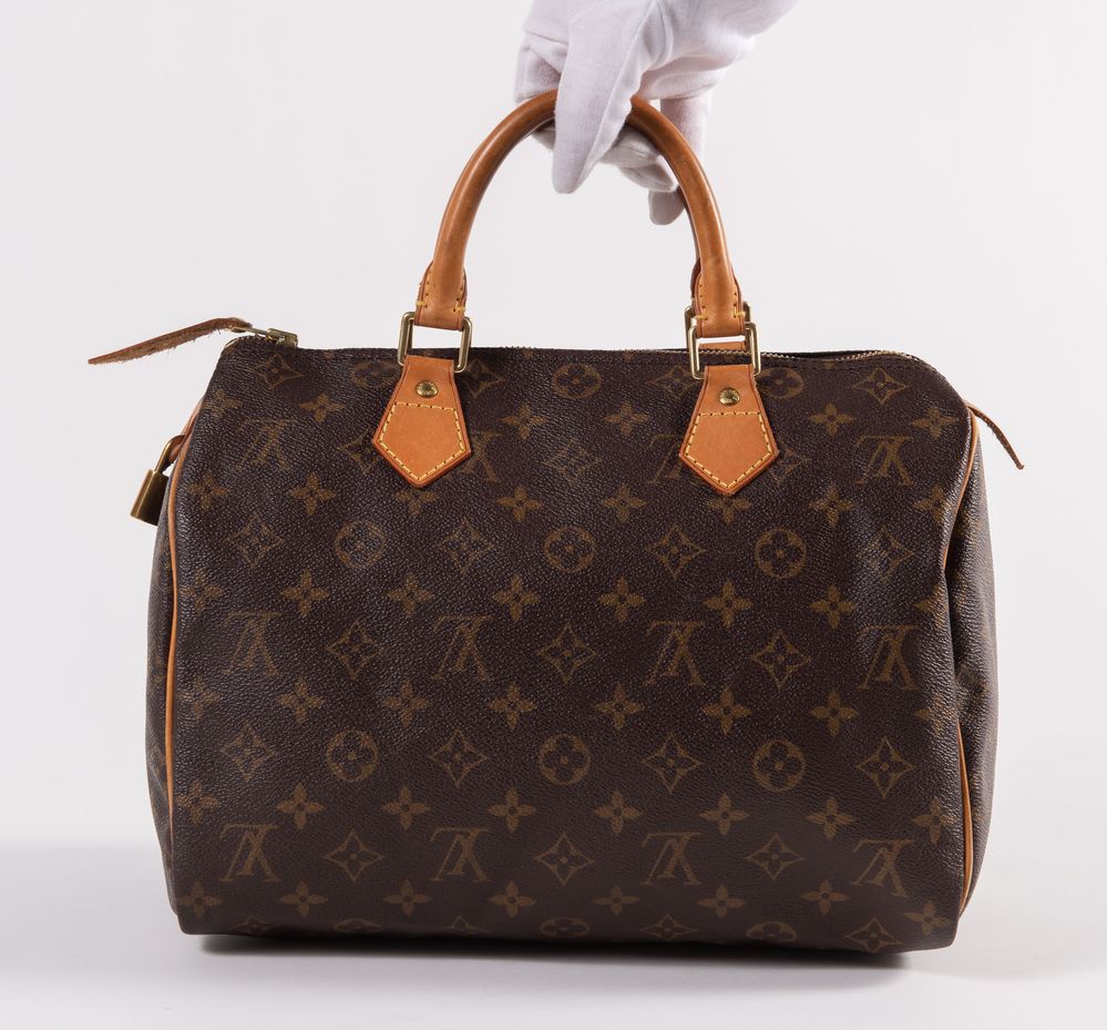 LOUIS VUTTON Borsa a bauletto modello Speedy 30 in tela monogram con rifiniture in cuoio e dettagli in metallo dorato. Cm 26x31x18. Altezza con manici: cm 32. Interno rifinito in tela con una tasca porta oggetti. Reca marchi LV, Louis Vuitton, Louis Vuitton Paris Made in France e codice di riferimento prodotto. Corredato di lucchetto e chiave originale. (Difetti)