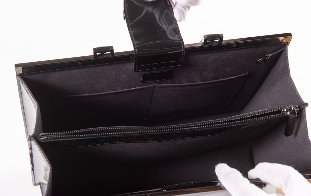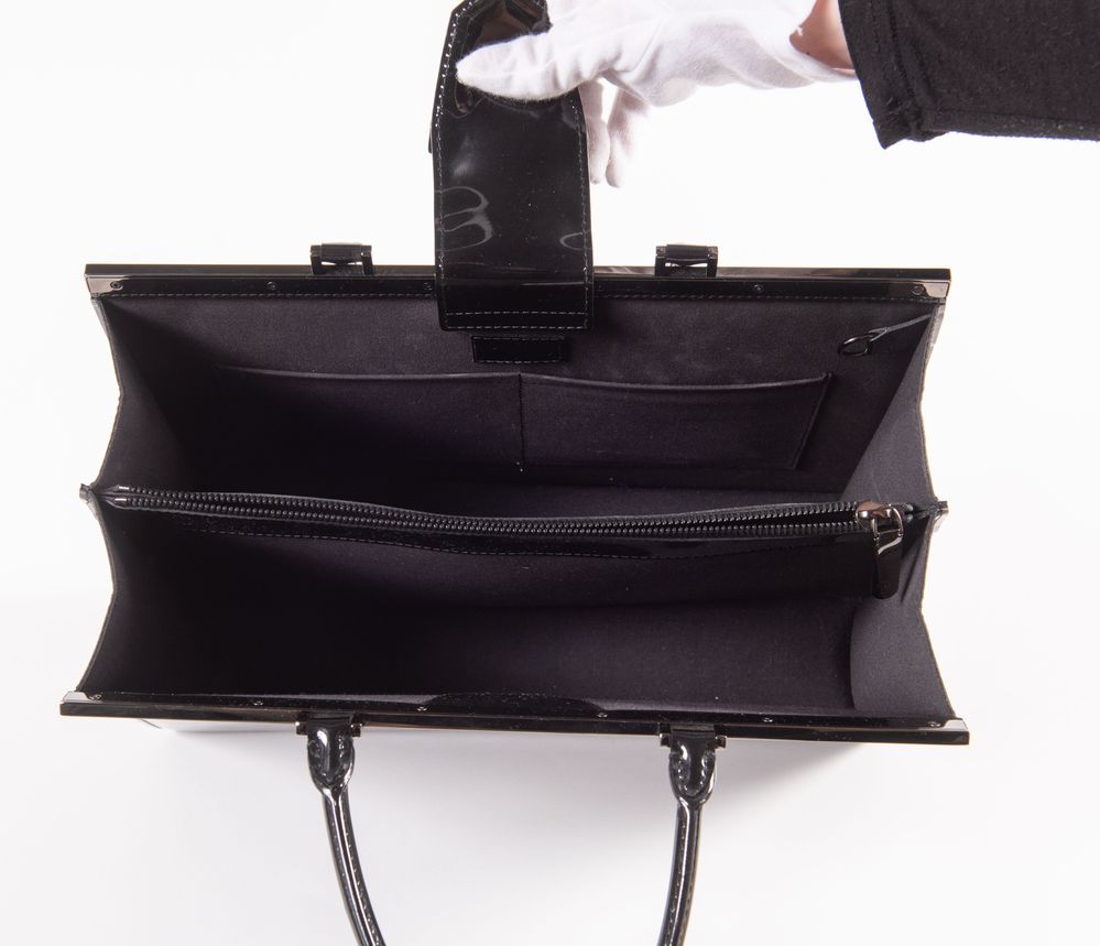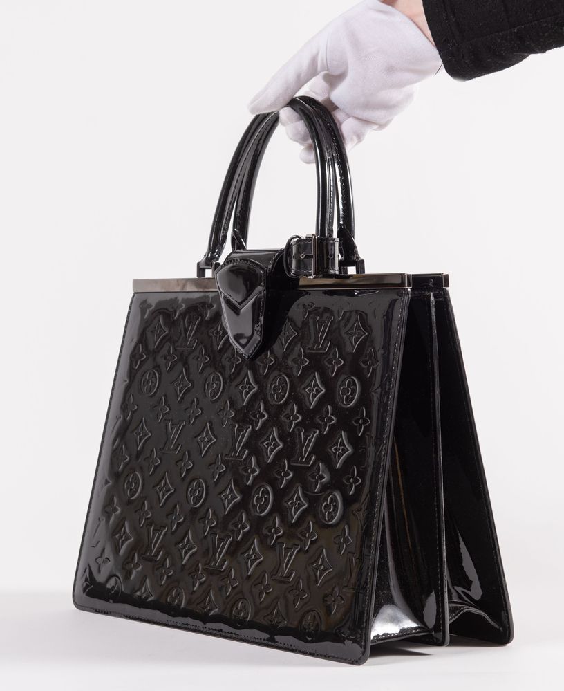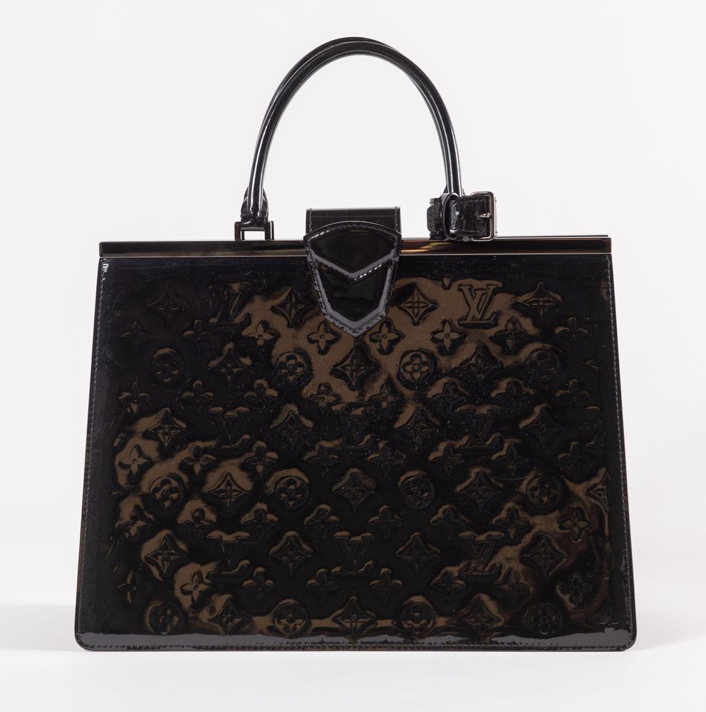 LOUIS VUITTON Borsa a mano modello Deessee in tela monogram vernis nera con dettagli in metallo color canna di fucile. Collezione anno 2013. Cm 26,5x36x14,5. Interno rifinito in tela con due vani porta oggetti e tre tasche di cui una chiusa da cerniera. Reca marchi LV, Louis Vuitton Paris, Made in France e codice di riferimento prodotto.