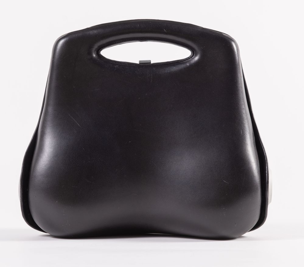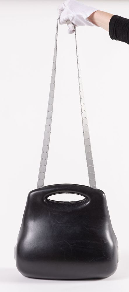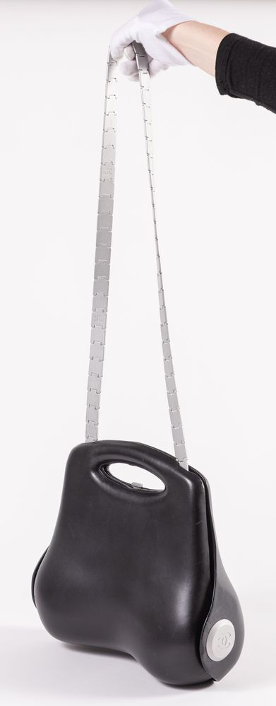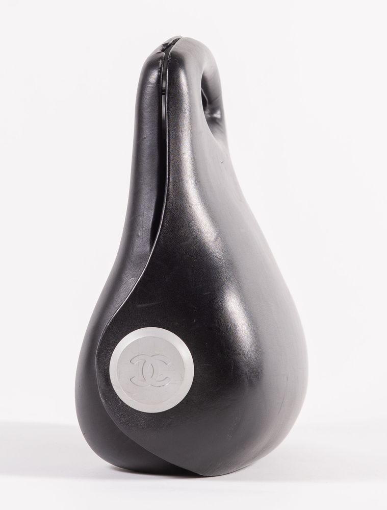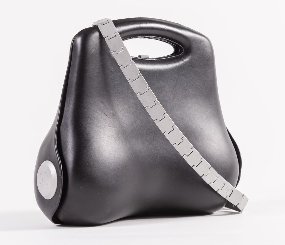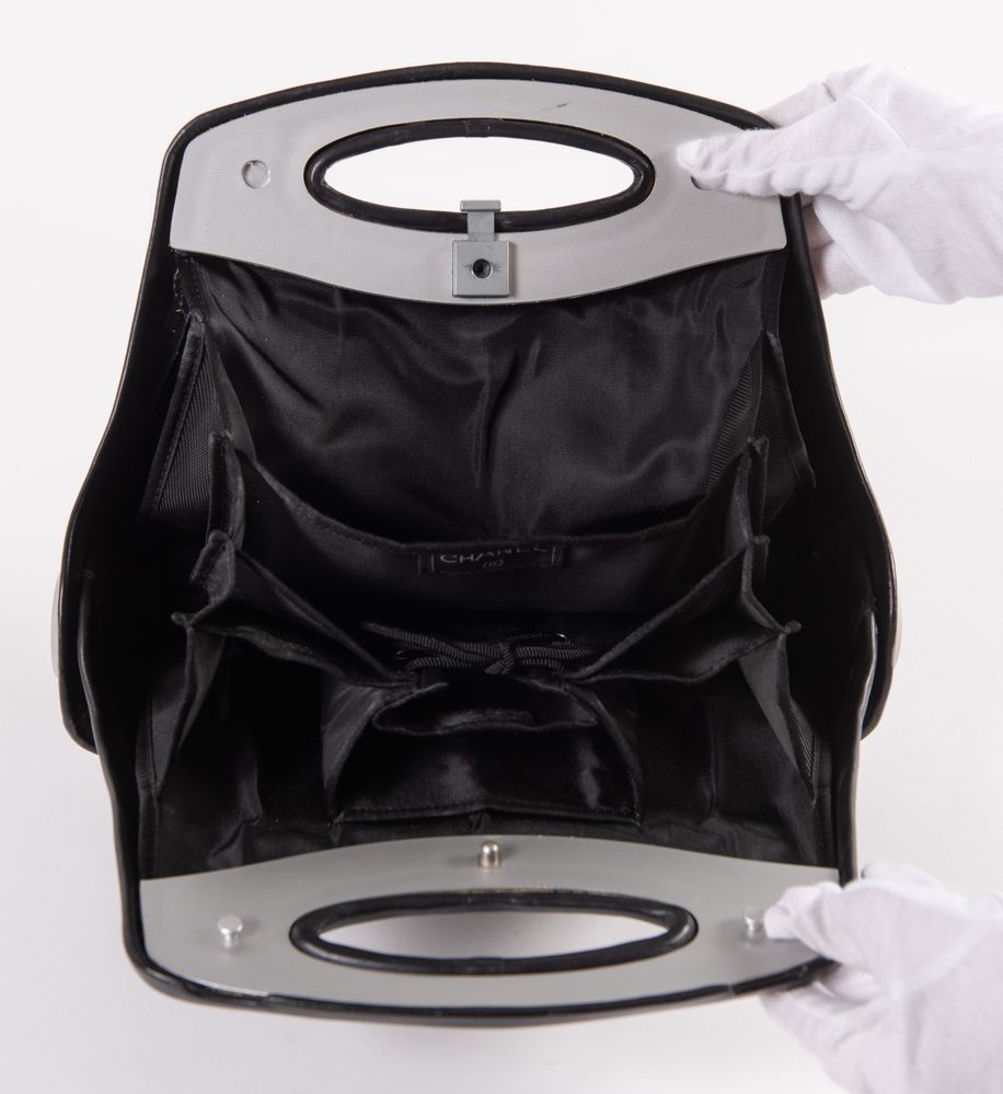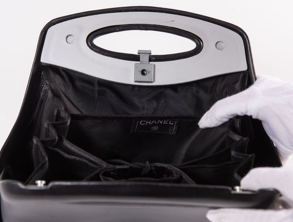 CHANEL Borsa rigida modello Millennium 2005 in pelle nera con rifiniture in metallo argentato satinato. Edizione limitata dell' anno 1999 disegnata da Karl Lagerfeld. Cm 29x31x12. Corredata di tracolla originale in metallo argentato satinato di cm 114. Interno in tela nera con 5 vani portaoggetti con chiusura a culisse. Reca marchi CC ed etichette Chanel, Made in France e 2005 Première Edition. Riporta codice di riferimento prodotto. (Segni di usura)