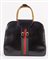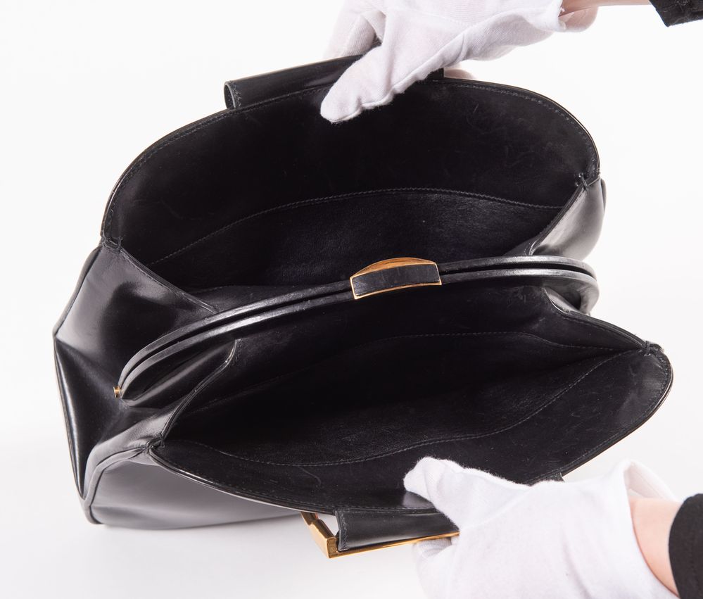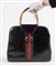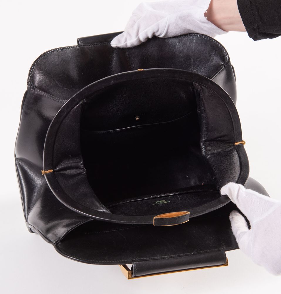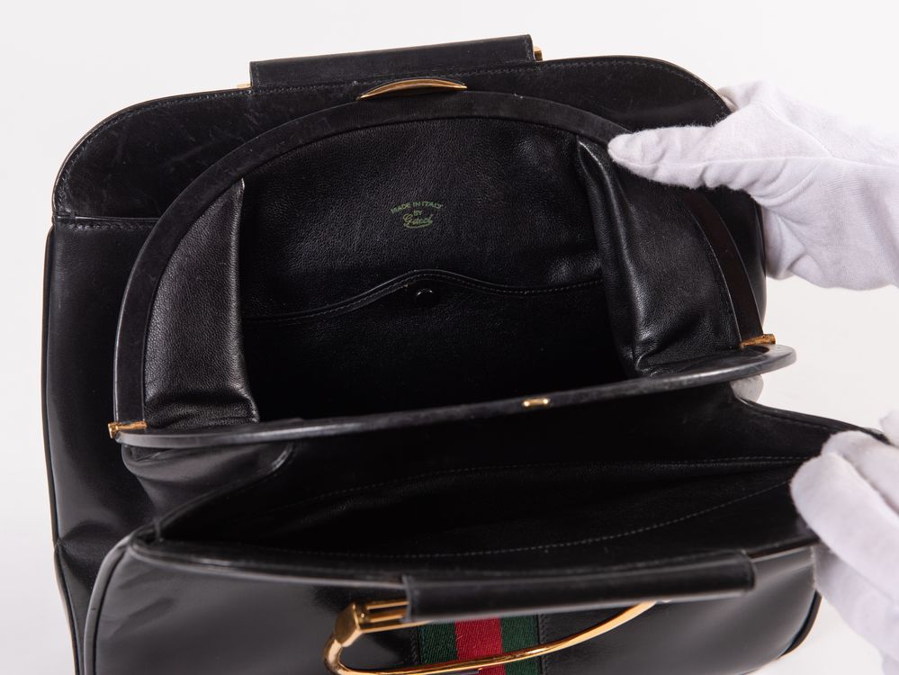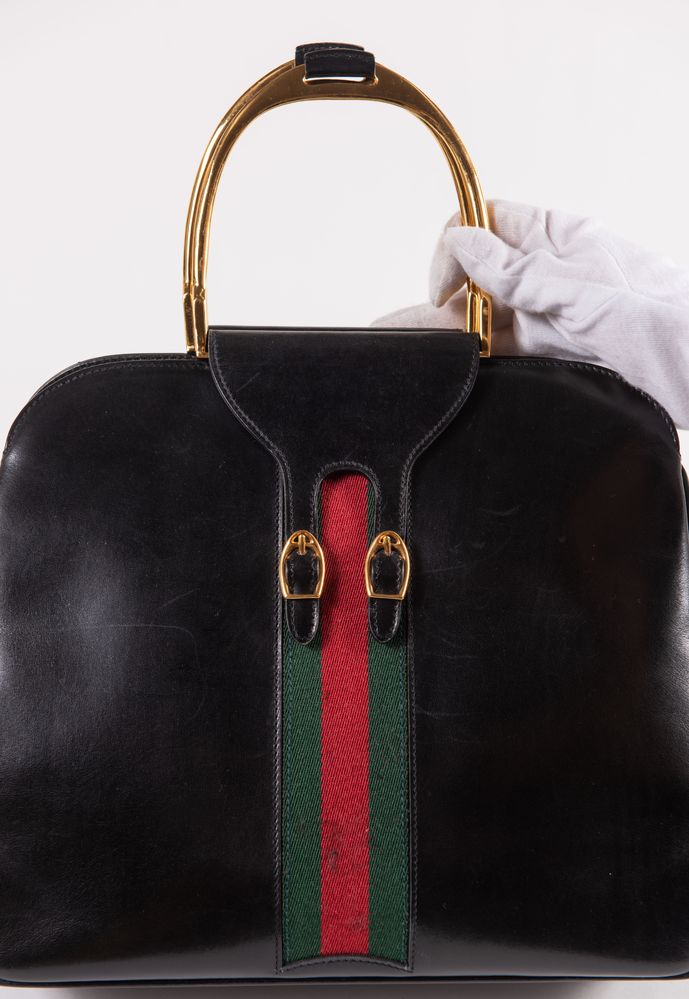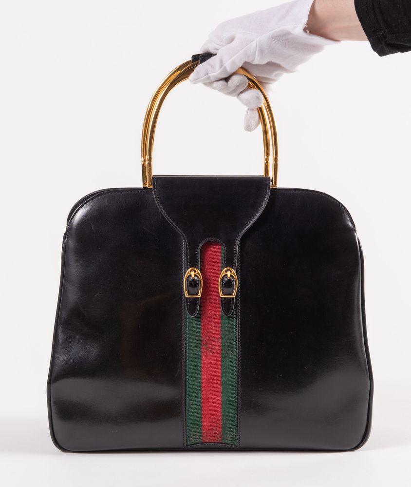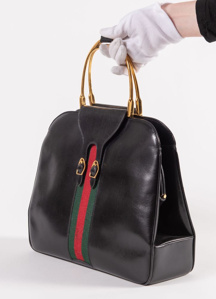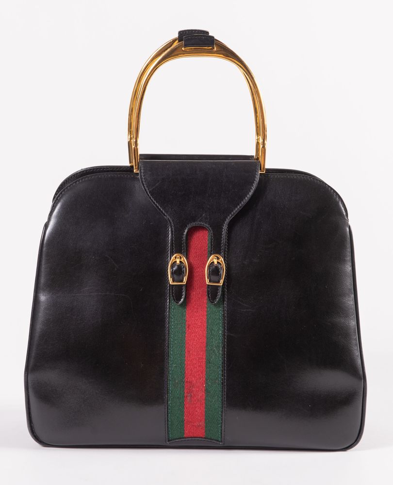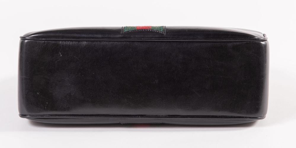 GUCCI Borsa a mano in pelle liscia nera con dettaglio Gucci Web centrale e rifiniture in metallo dorato. Anni '70. Cm 27x32x10. Altezza con manico: cm 40. Interno rifinito in pelle con tre vani portaoggetti e due tasche chiuse da bottone automatico. Accompagnata da borsellino porta monete coordinato. Reca marchio Made in Italy by Gucci. Corredata di dustbag originale. (Lievi difetti)