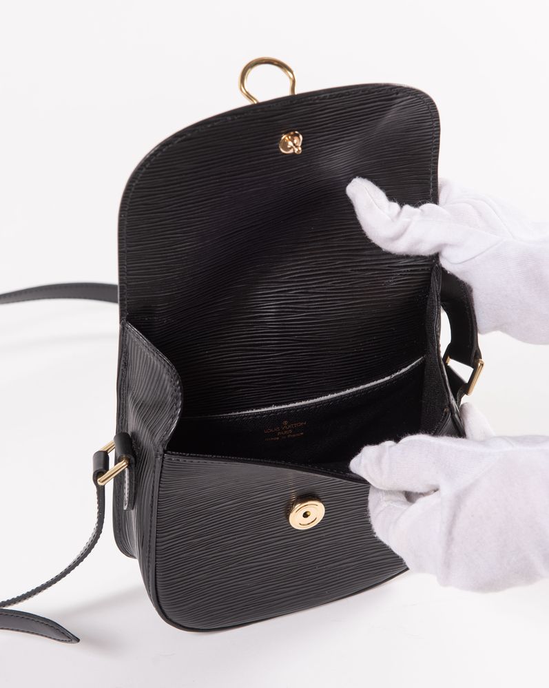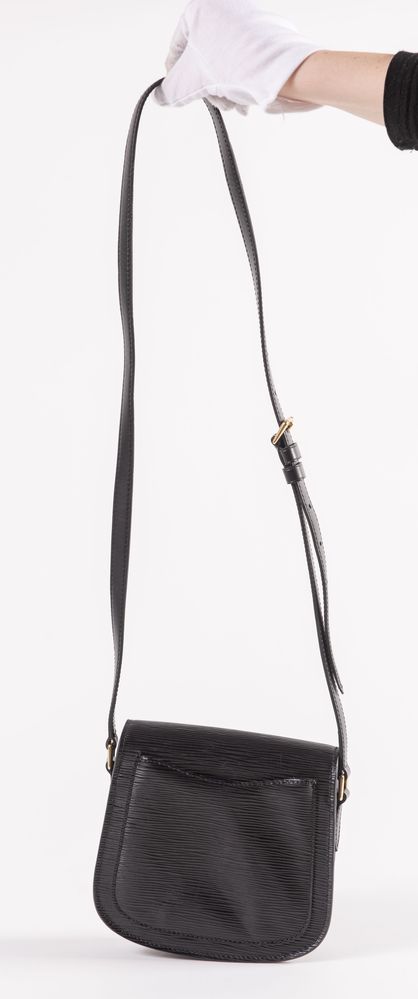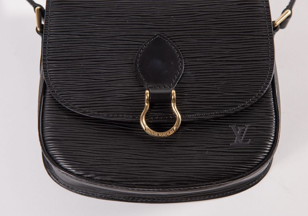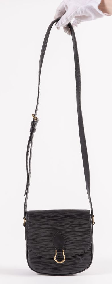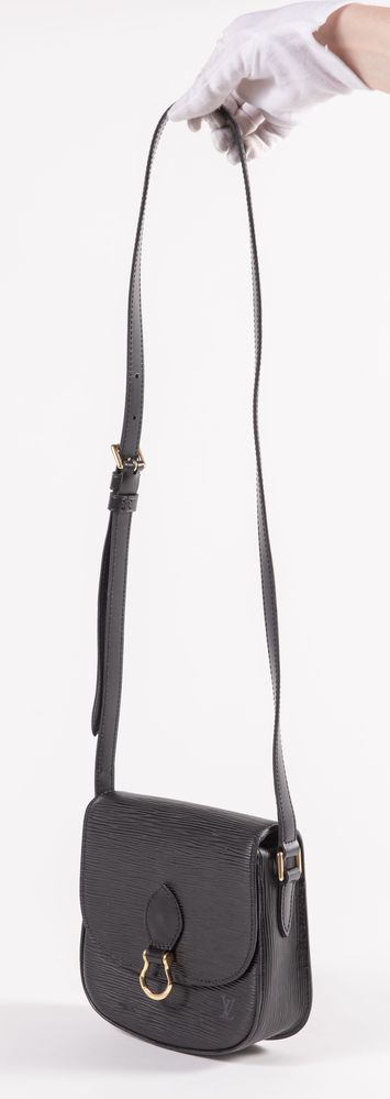 LOUIS VUITTON Borsa a tracolla modello Saint Cloud in pelle taiga nera con dettagli e rifiniture in metallo dorato. Cm 17x17x6. Lunghezza totale tracolla: cm 127. Sul lato esterno posteriore presenta una tasca porta oggetti. Interno rifinito in pelle con una tasca porta oggetti. Reca marchi LV, Louis Vuitton e Louis Vuitton Paris Made in France e codice di riferimento prodotto. (Difetti)