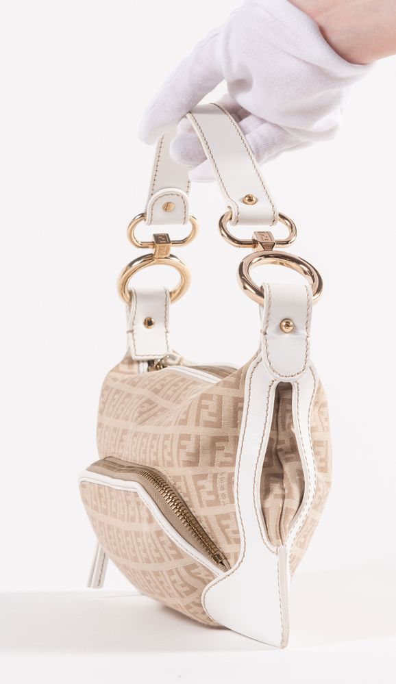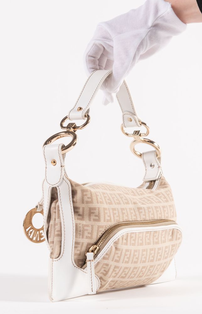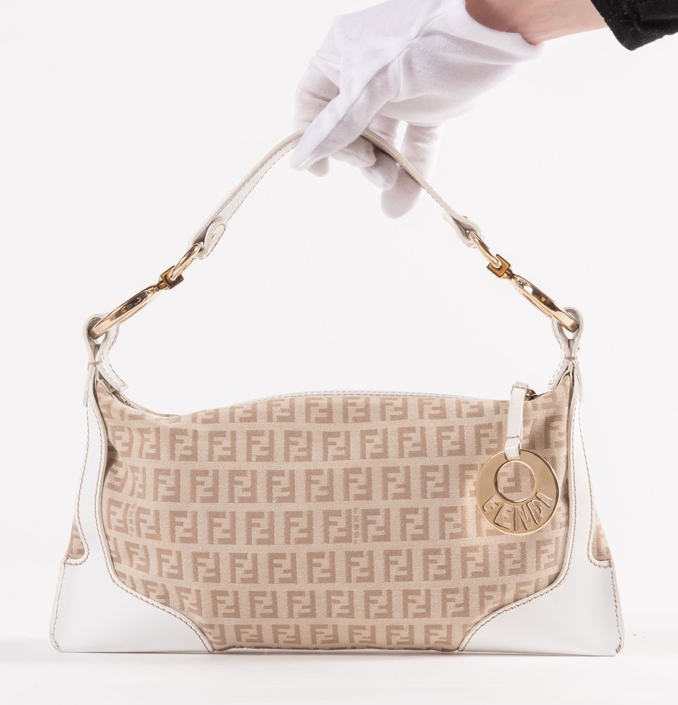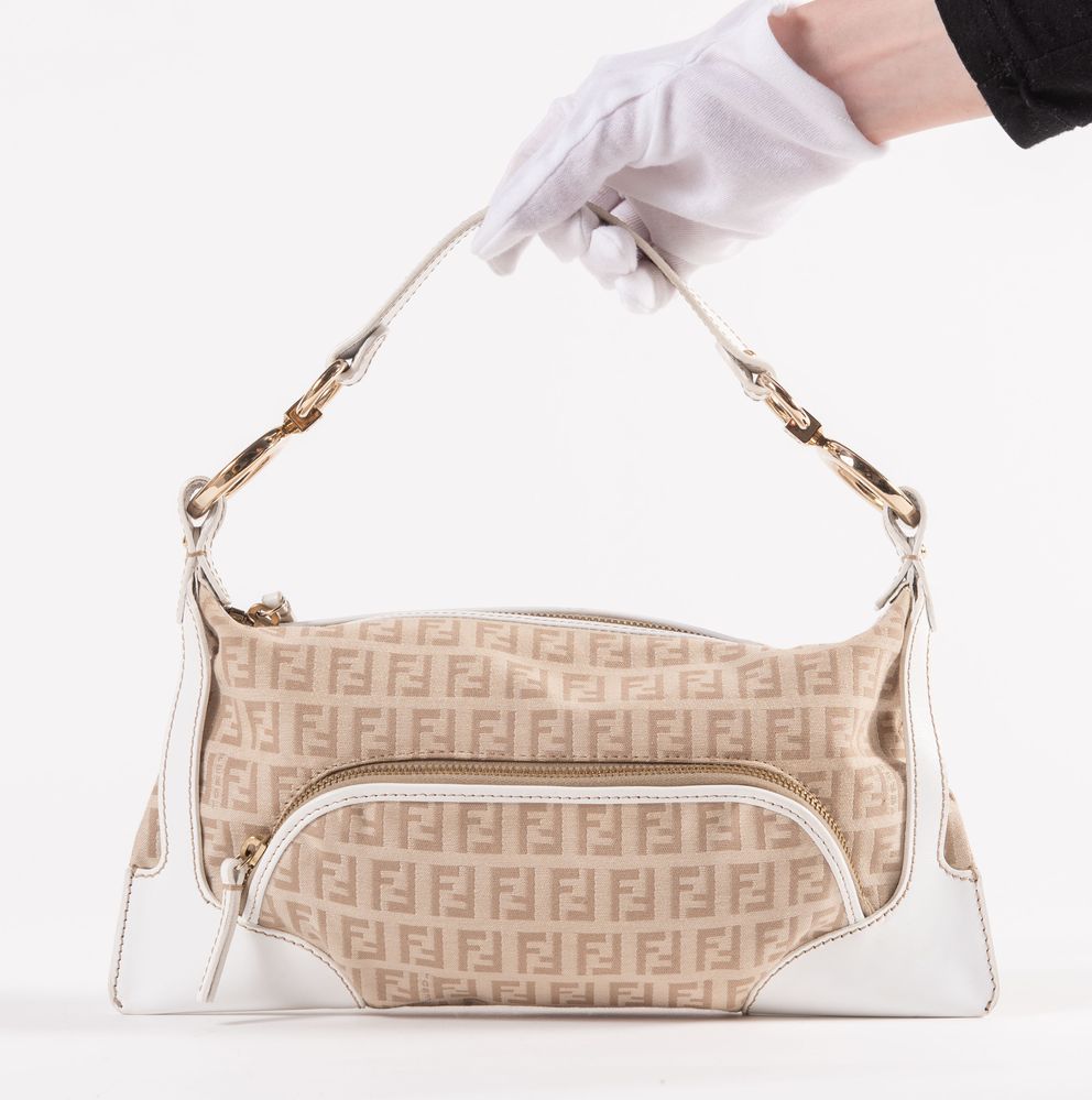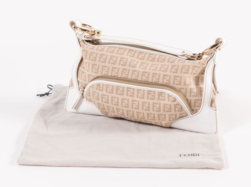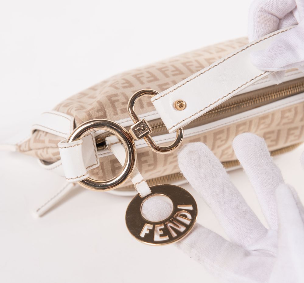 FENDI Borsa da spalla modello baguette in tela monogram con rifiniture pelle bianca e dettagli in metallo dorato. Cm 14x29x4. Altezza con manico: cm 25. Sul lato frontale presenta una tasca chiusa da cerniera. Interno rifinito in tela logata con una tasca porta oggetti. Reca marchi FF, Fendi, Fendi Made in Italy e codice di riferimento prodotto. Accompagnata da certificato di vendita con dettagli e specifiche dell'oggetto. Corredata di dustbag originale.