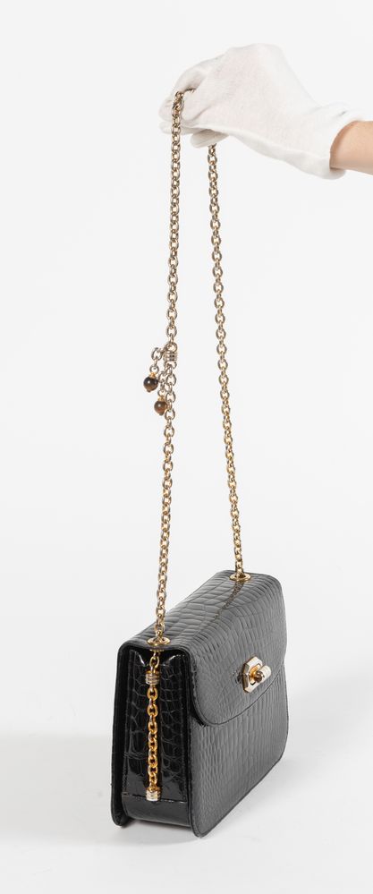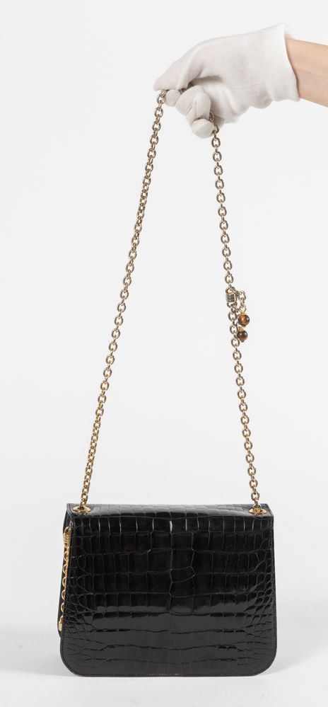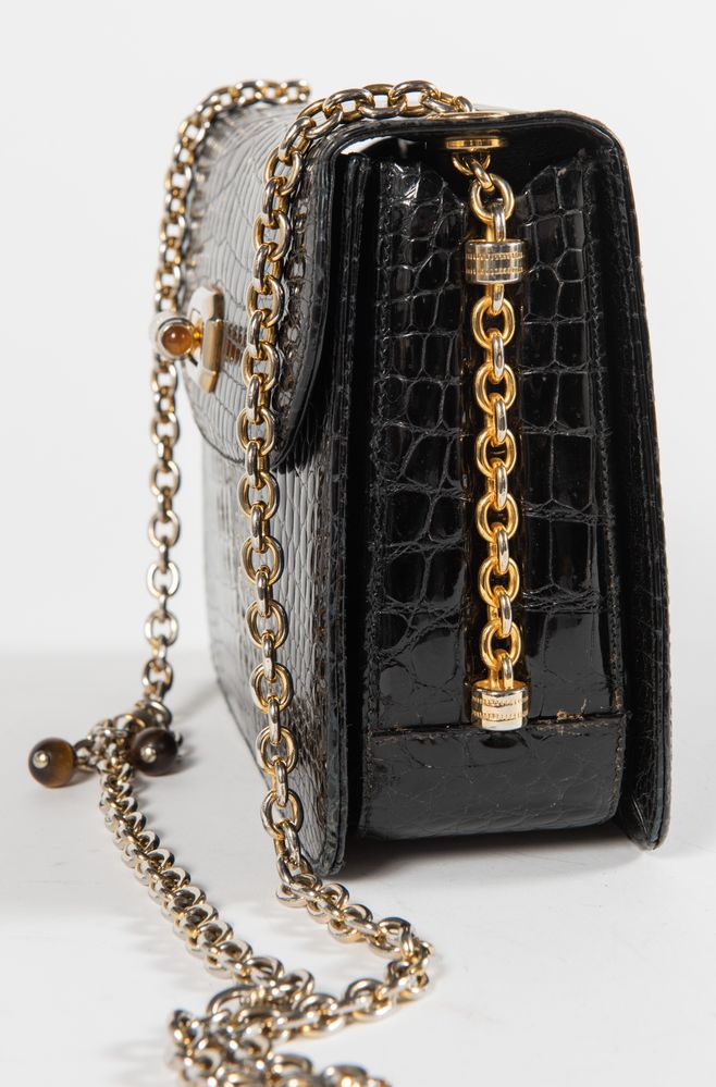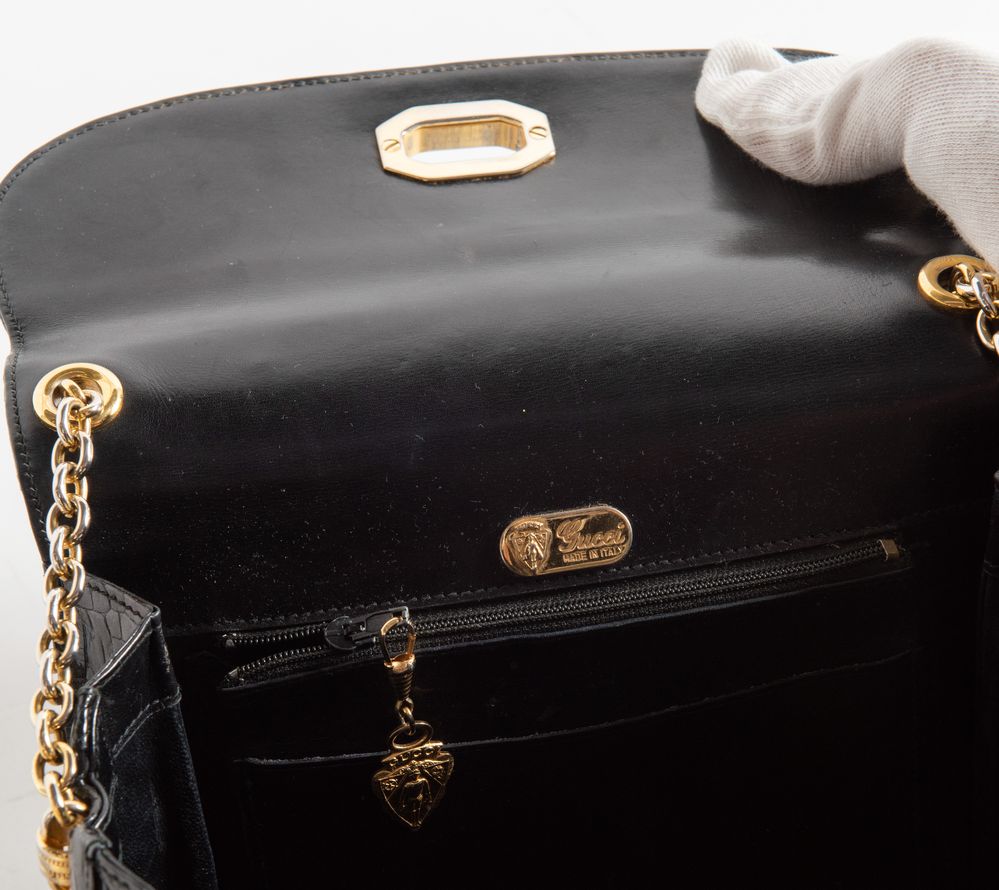 GUCCI Borsa da spalla in pelle di coccodrillo nera con manico a catena e rifiniture in metallo dorato. Collezione anno 1969. Cm 17x22x9,5. Altezza con manico: cm 60. Interno in pelle nera con tre tasche di cui una chiusa da cerniera. Reca marchi Gucci Made in Italy e Cavaliere. Corredata di dustbag originale.