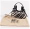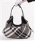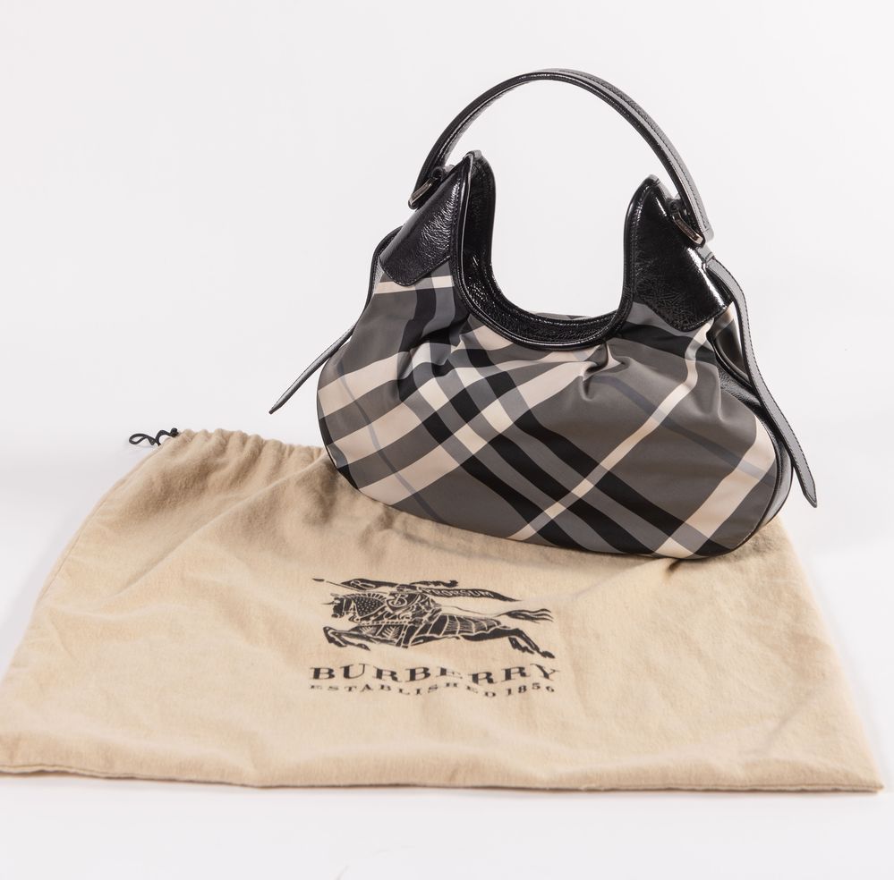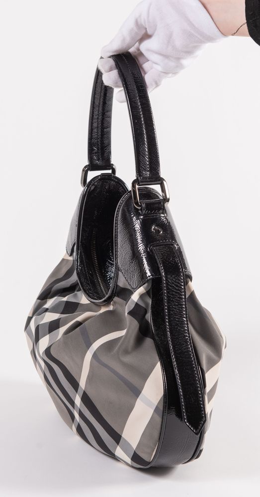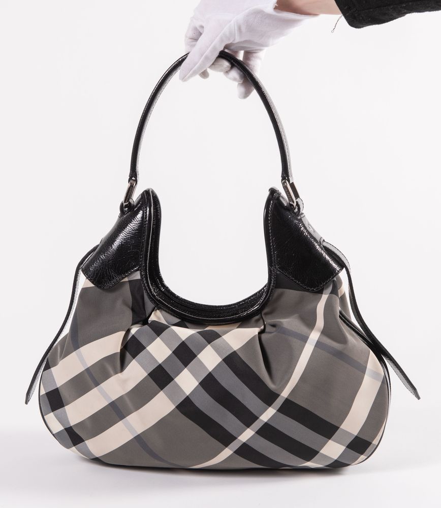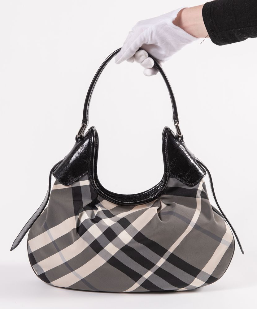 BURBERRY Borsa da spalla in tela nel classico motivo check sui toni del grigio con rifiniture in pelle lucida e dettagli in metallo argentato. Cm 29x34x9. Altezza con manico: cm 42. Interno rifinito in tela con tre tasche di cui una chiusa da cerniera. Reca marchi Burberry Burberry Established 1856. Accompagnata da ricevuta di acquisto. Corredata di dustbag originale.
