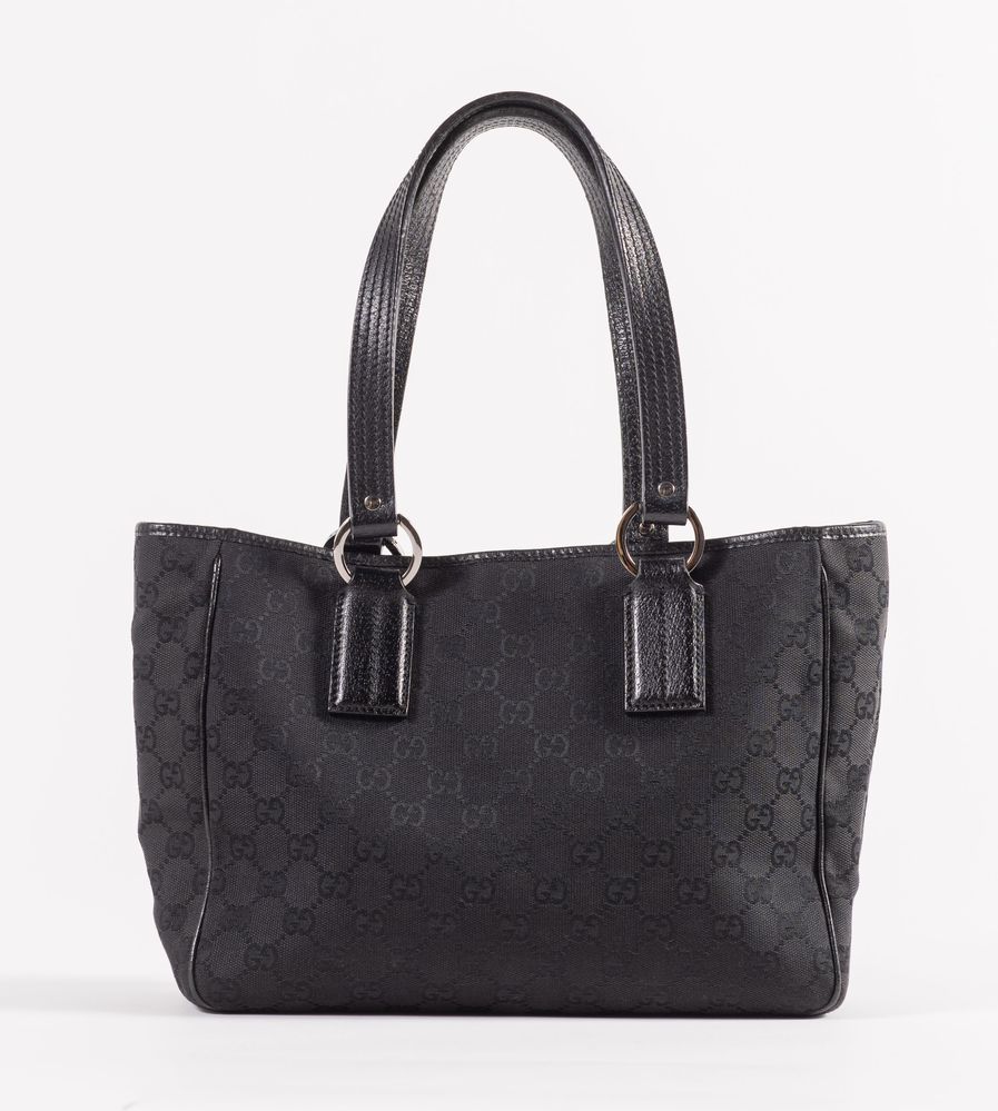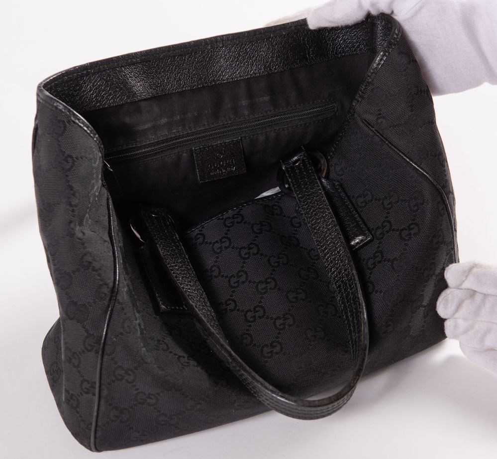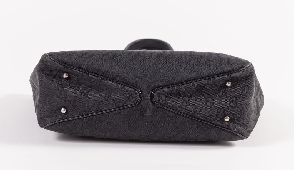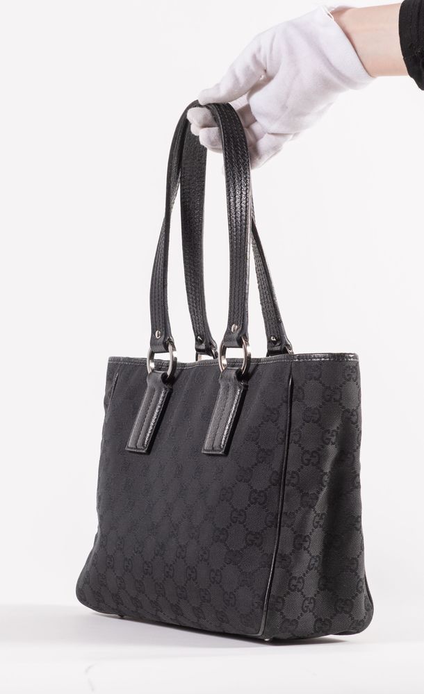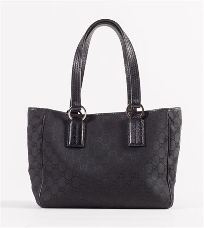 GUCCI Borsa da spalla in tela nera monogram con rifiniture in pelle e dettagli in metallo argentato. Cm 22x32,5x10. Altezza con manico: cm 42. Interno in tela con una tasca chiusa da cerniera. Reca marchi GG, Gucci, Gucci Made in Italy e codice di riferimento prodotto. (Lievi difetti)