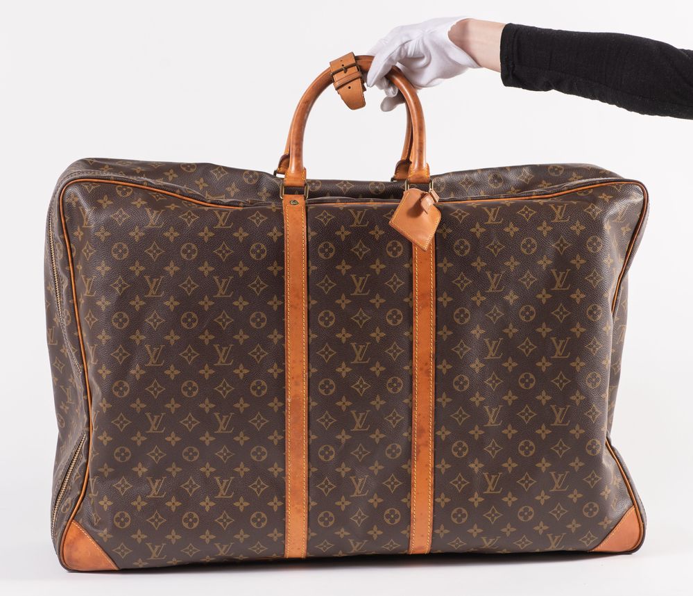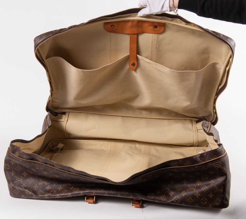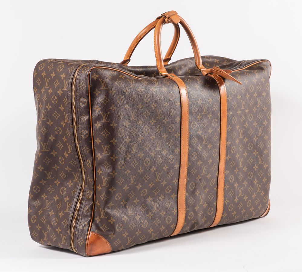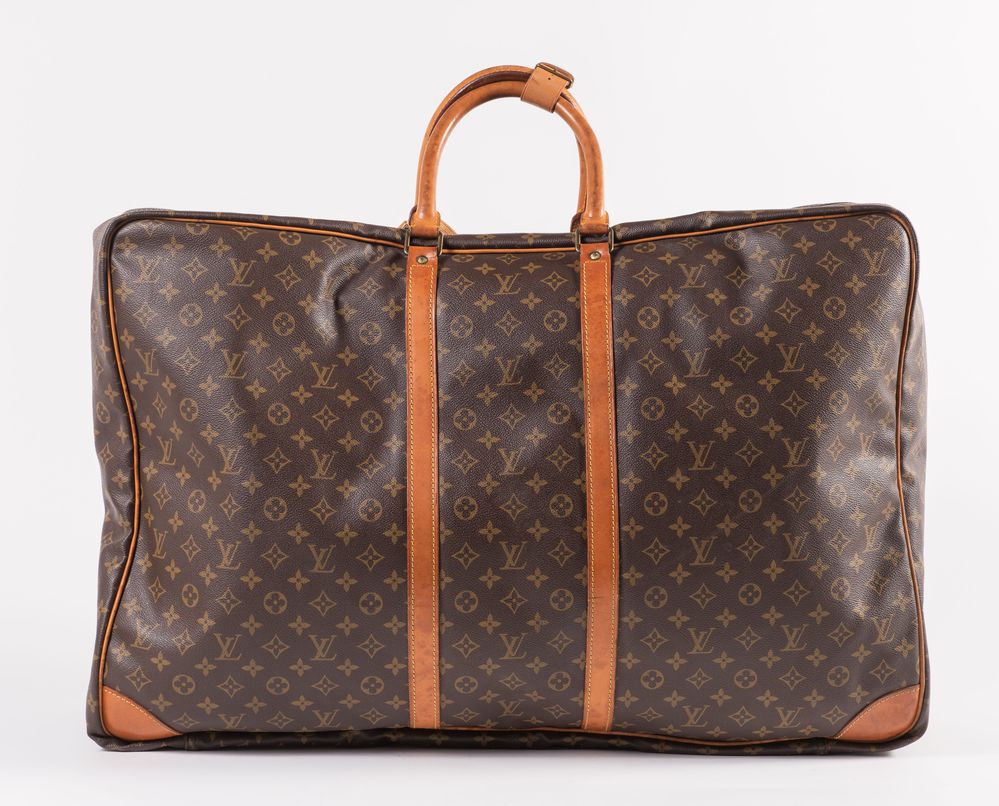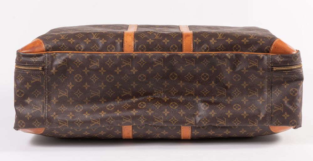 LOUIS VUITTON Borsone da viaggio modello Sirius in tela monogram con rifiniture in cuoio e dettagli in metallo dorato. Cm 50x68x19. Altezza con manico: cm 60. Interno rifinito in tela beige con una tasca porta oggetti chiusa da bottone automatico ed elastici porta abiti. Reca marchi LV, Louis Vuitton, Louis Vuitton Paris Made in France e codice di riferimento prodotto. (Difetti)